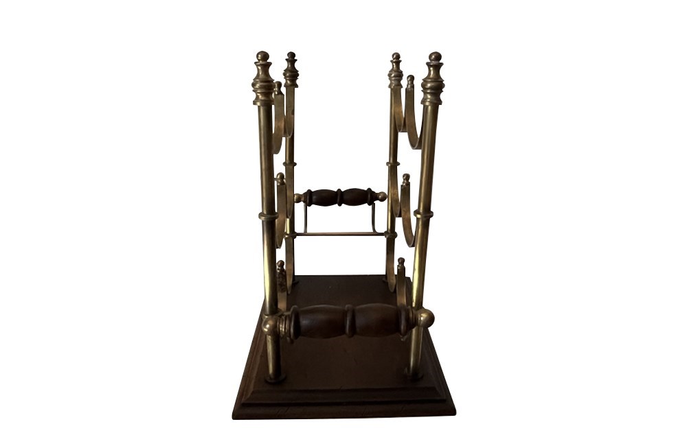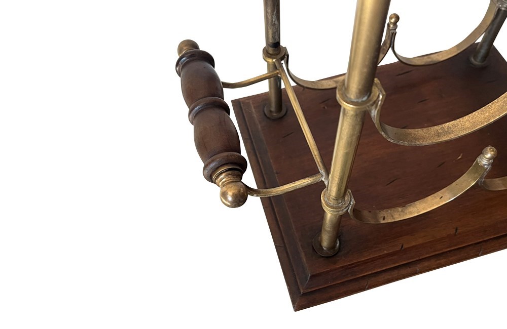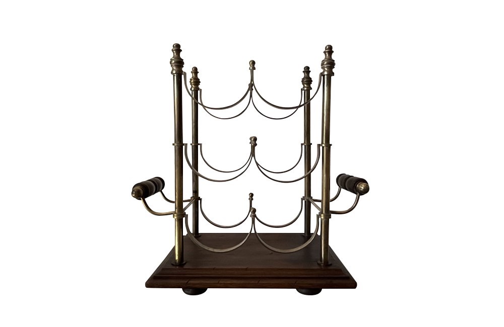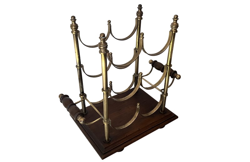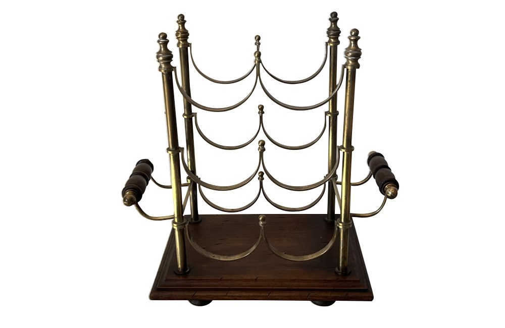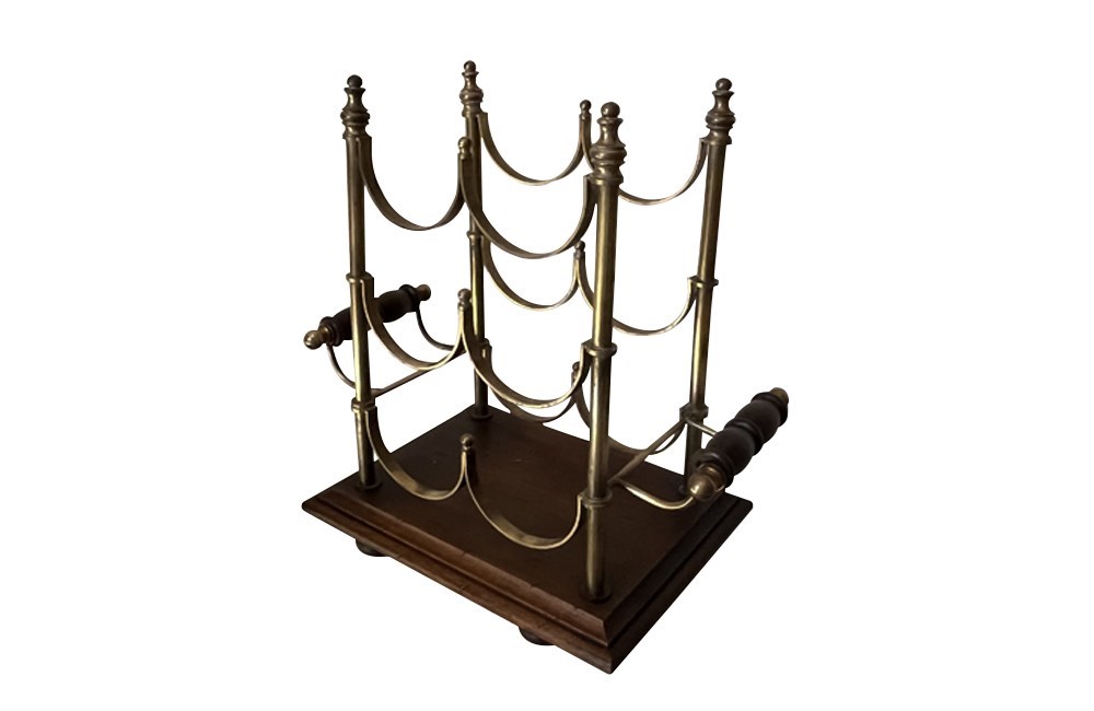 20th Century French brass wine rack on a wooden plinth with two wooden handles.