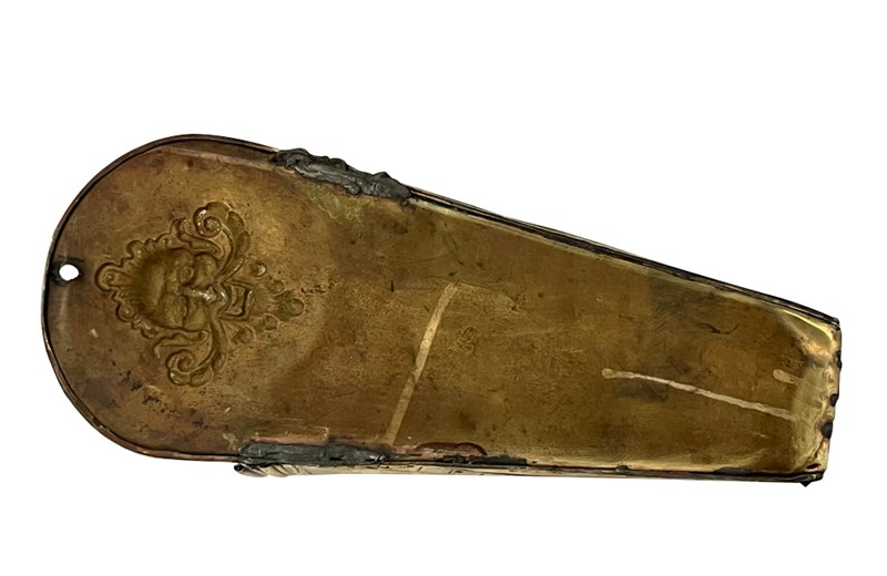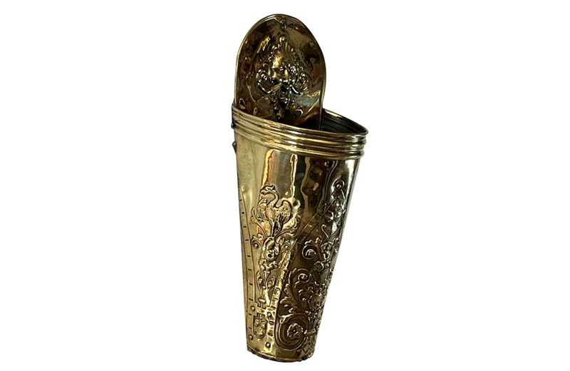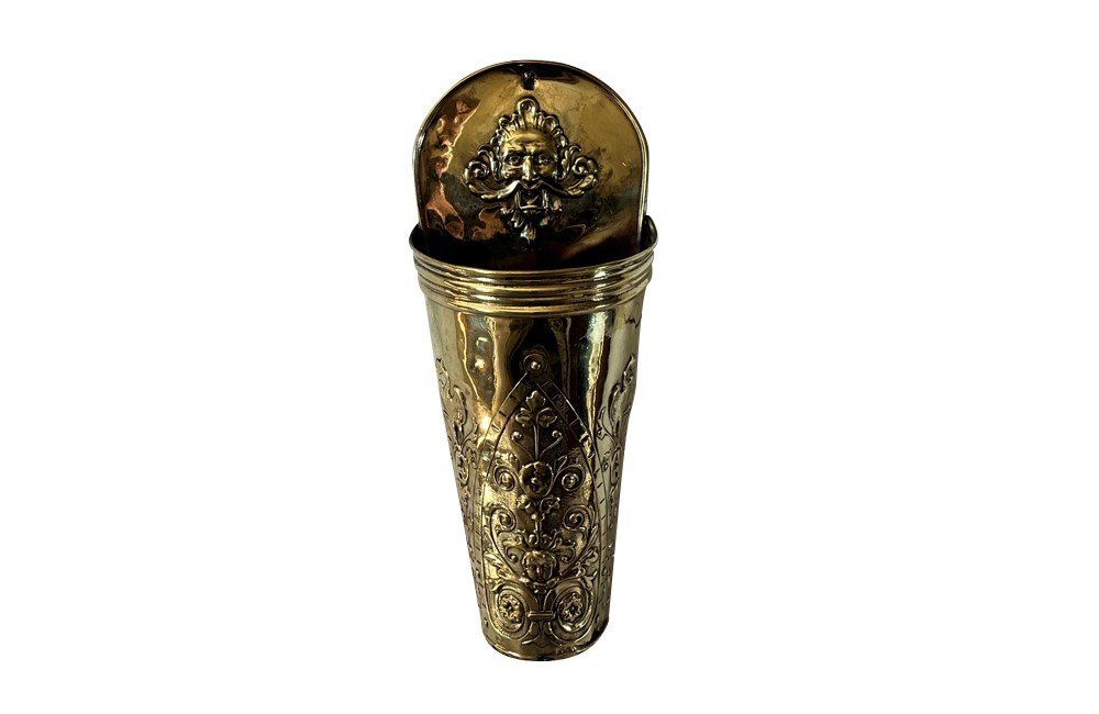 Dating to the early 19th Century, this larger rare example was was originally used to store taper candles. It would also be a fabulous wooden utensil holder in any country or modern kitchen. Beautifully embellished with embossed decoration, including a satyr masque, cherub, birds and scrolled floral and foliate motifs.