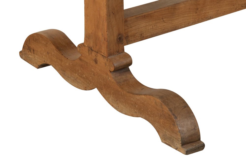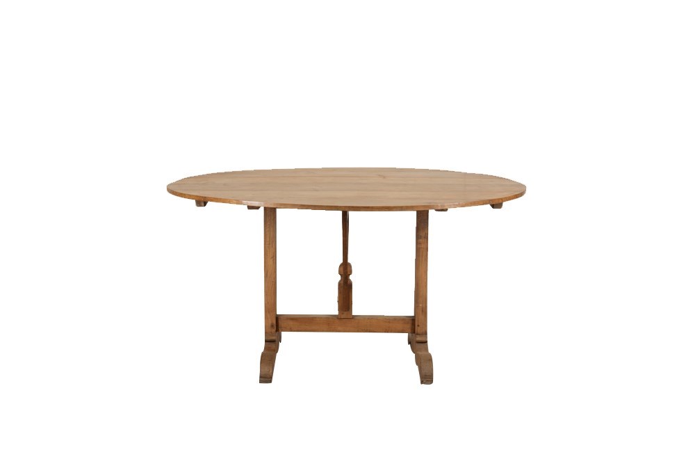 Traditionally designed to tilt upright for storage, the original mechanism remains intact beneath the top—an appealing detail that speaks to its vineyard origins and practical design. The table has benefited from careful historic restoration, helping preserve its structure while enhancing the natural beauty and warmth of the cherry. With its generous scale, beautiful patina, and strong sculptural form, this table works equally well as a dining table, statement kitchen table, or centrepiece within an interior, bringing warmth, authenticity, and understated French provincial elegance to a space.