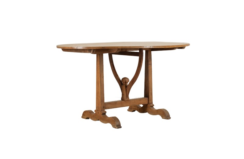 Featuring a beautifully proportioned oval top supported by a sculptural trestle base. The timber has developed a rich warm honey tone, enhancing the depth of the grain and lending the piece a refined yet authentic character. The plank-constructed top rests on a graceful base with shaped feet, substantial uprights, and a striking curved brace centred on a turned finial detail. This architectural base provides both strength and visual presence, giving the table a balanced silhouette that sits comfortably in both classic and contemporary interiors.