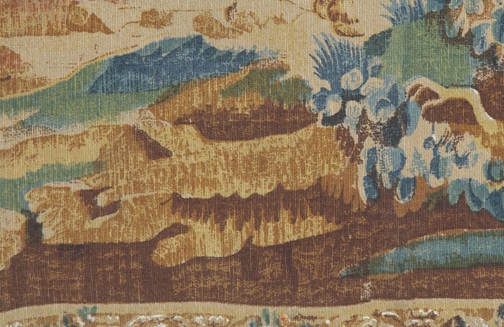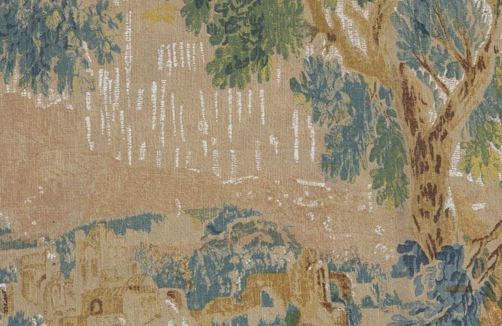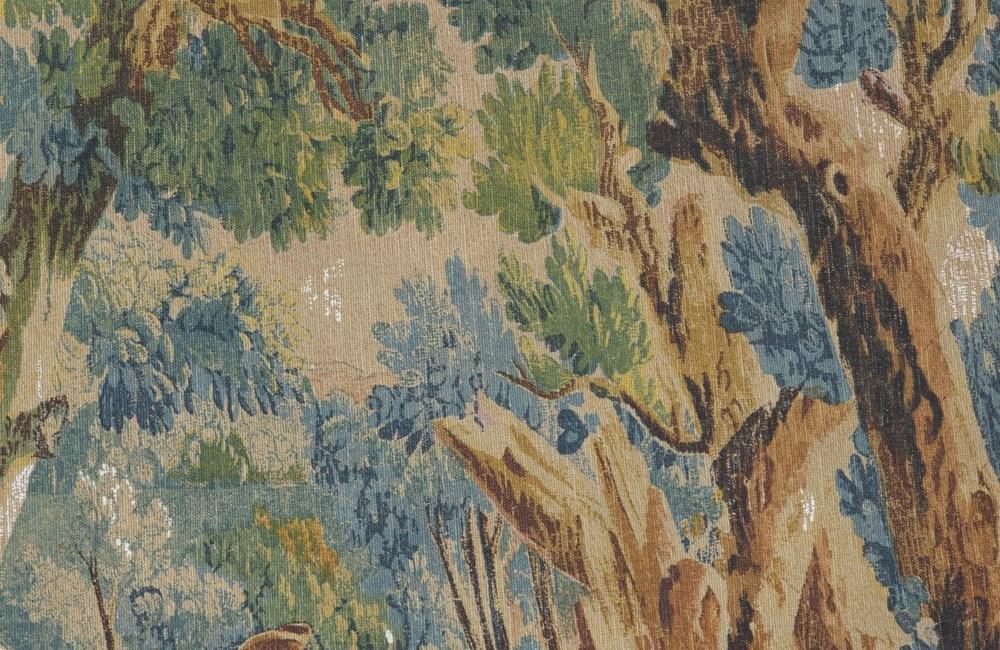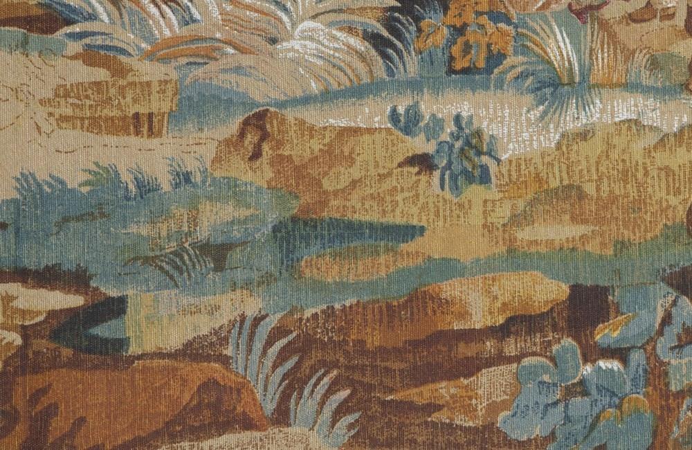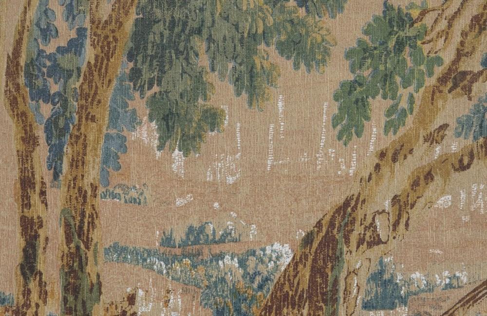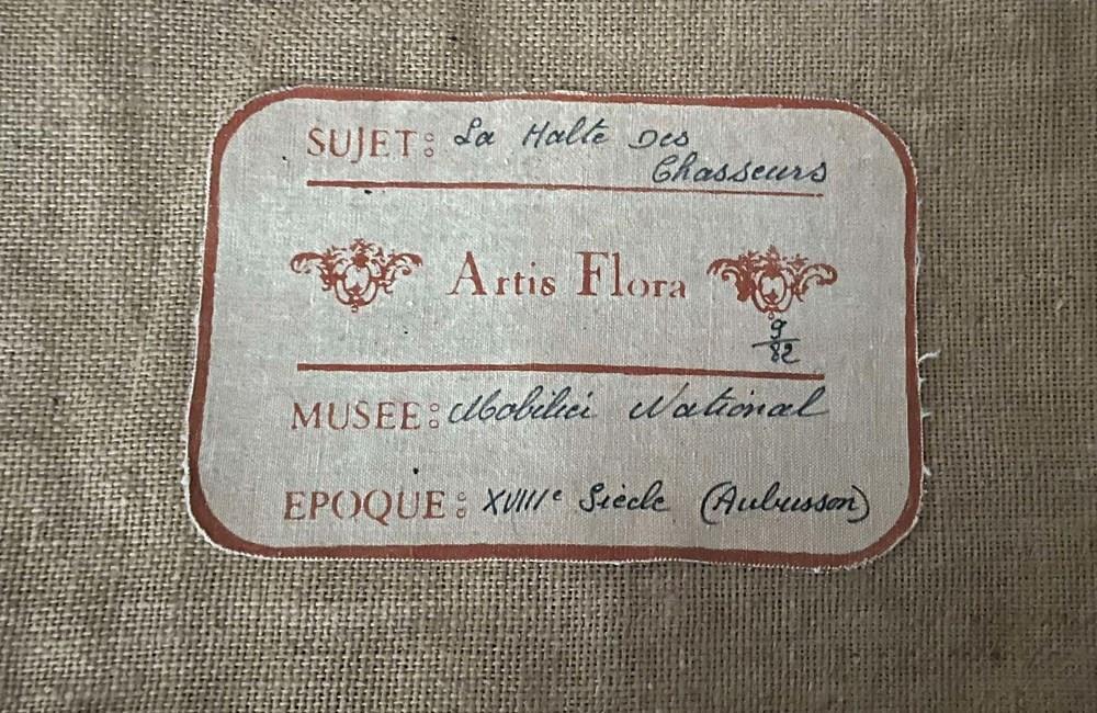After the original 18th Century Aubusson tapestry at the Musee Mobilieri National. Cotton linen backed with hessian. Screen printed by hand in the Paris workshops of the renown Artis Flora. With the label of Artis Flora 9/82.