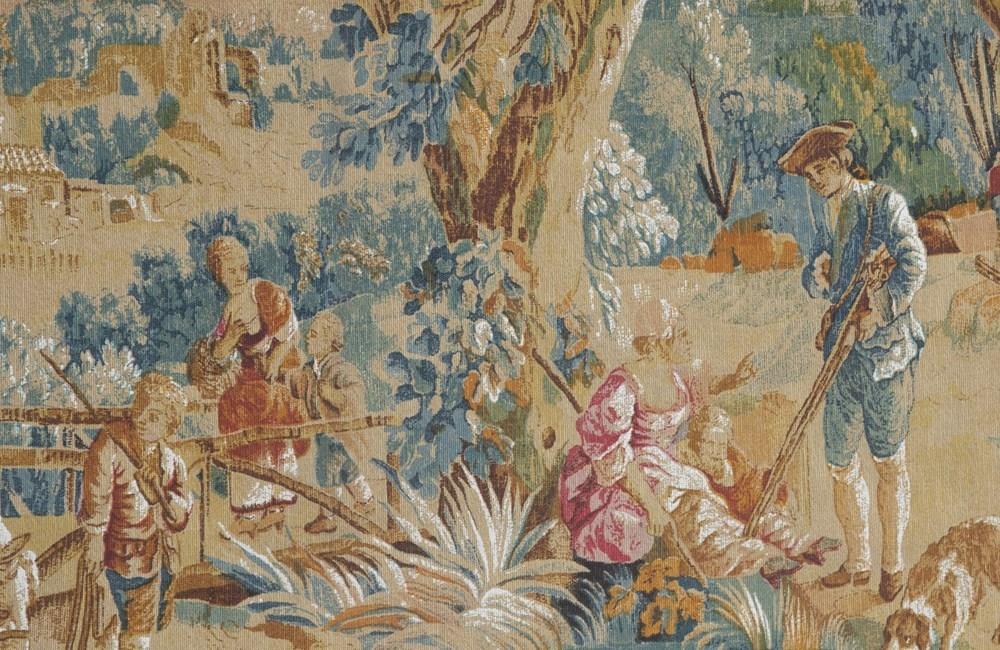 Large 20th Century French screen printed tapestry 'La Halte Des Chasseurs' (Hunter's Halt).