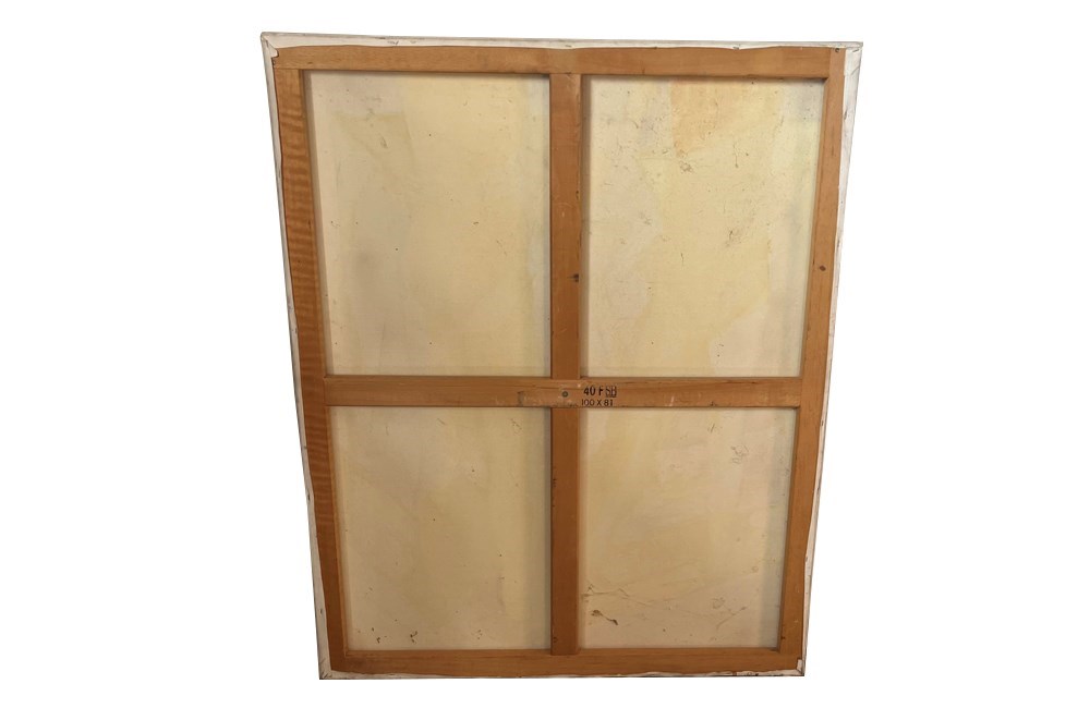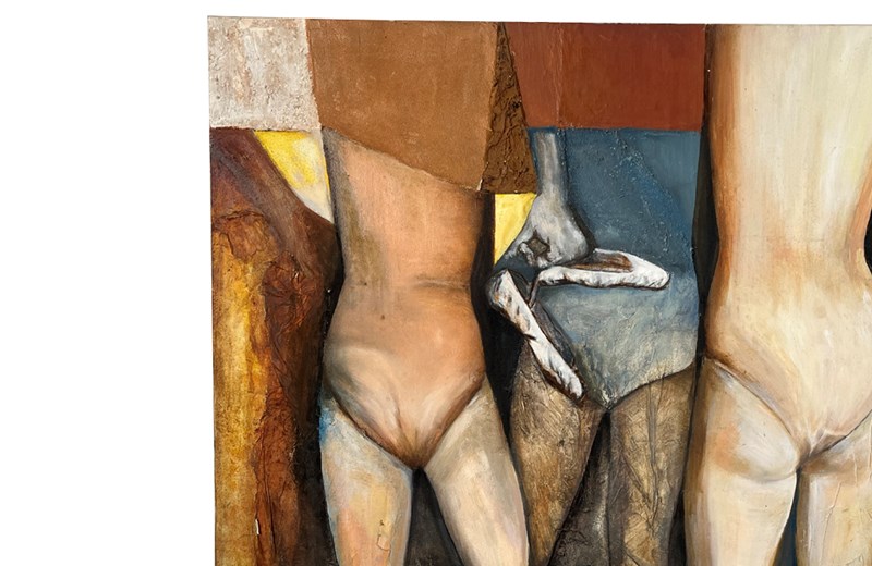 Executed in oil with textured collage elements, the surface shows rich material depth, with areas of built-up pigment and relief-like texture that add visual interest and tactile presence. The work reflects mid- to late-20th-century European modernist influences, combining figurative structure with post-cubist abstraction.