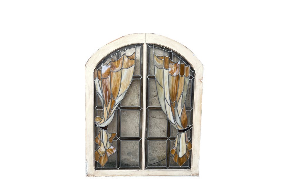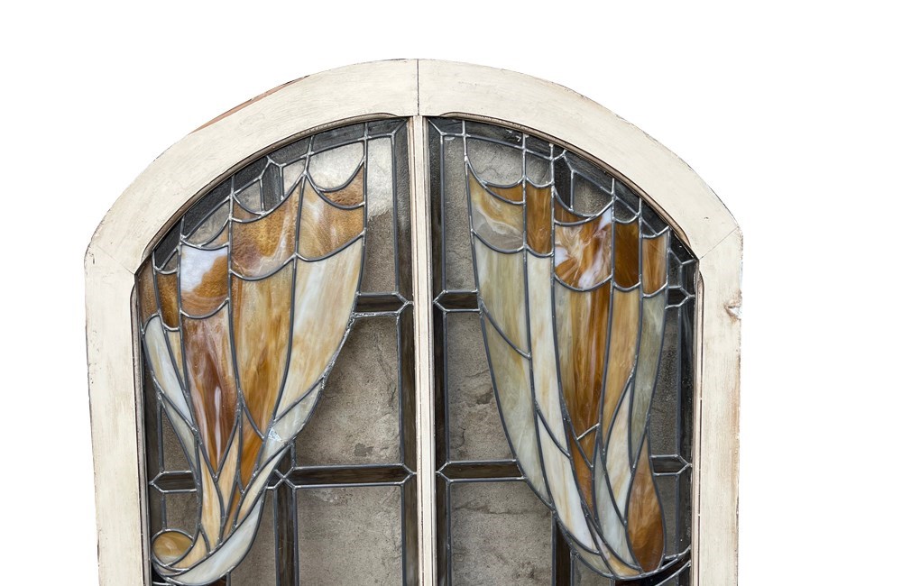 Fabulous French arched double-panel window, featuring hand-leaded stained glass.