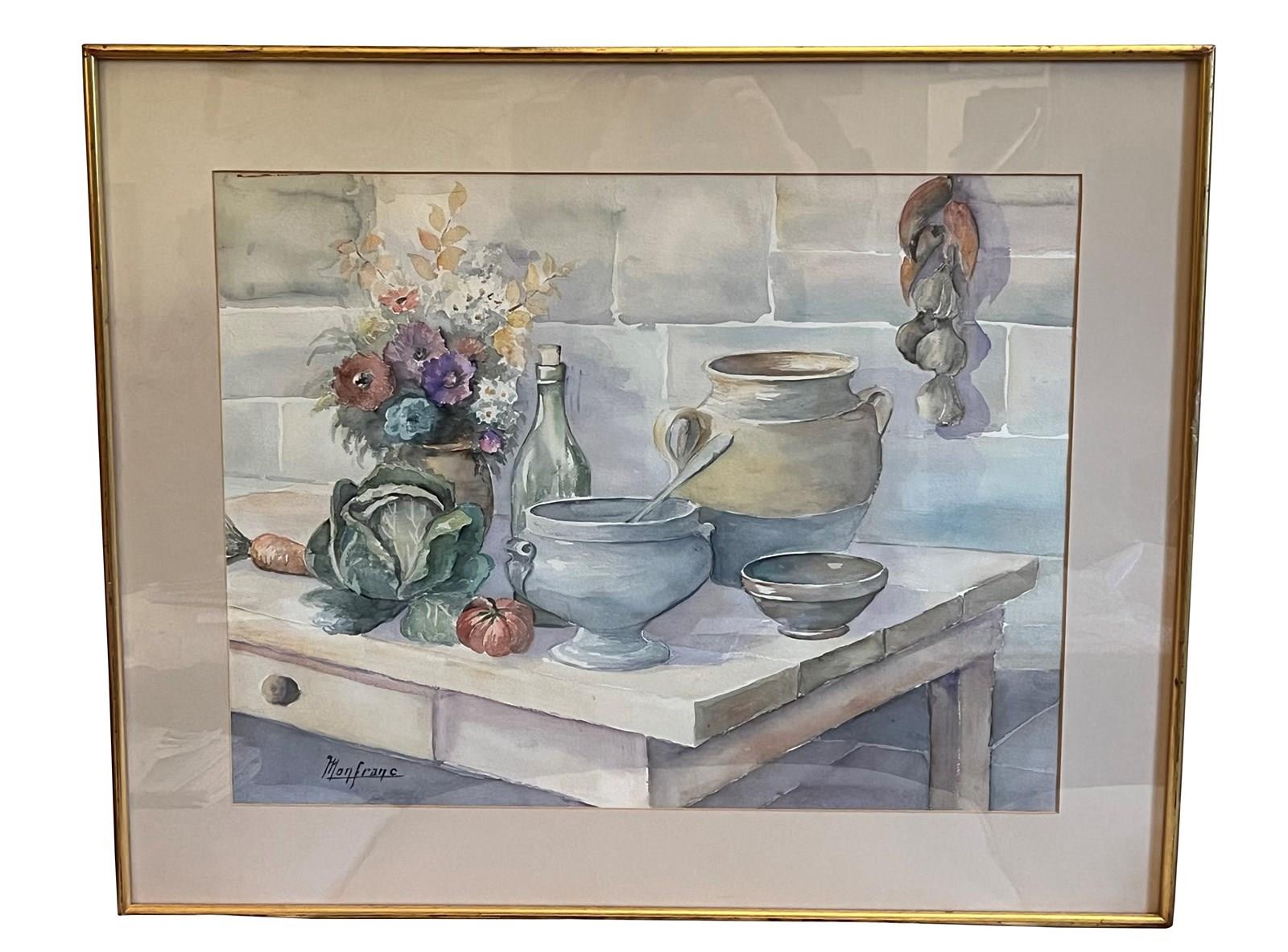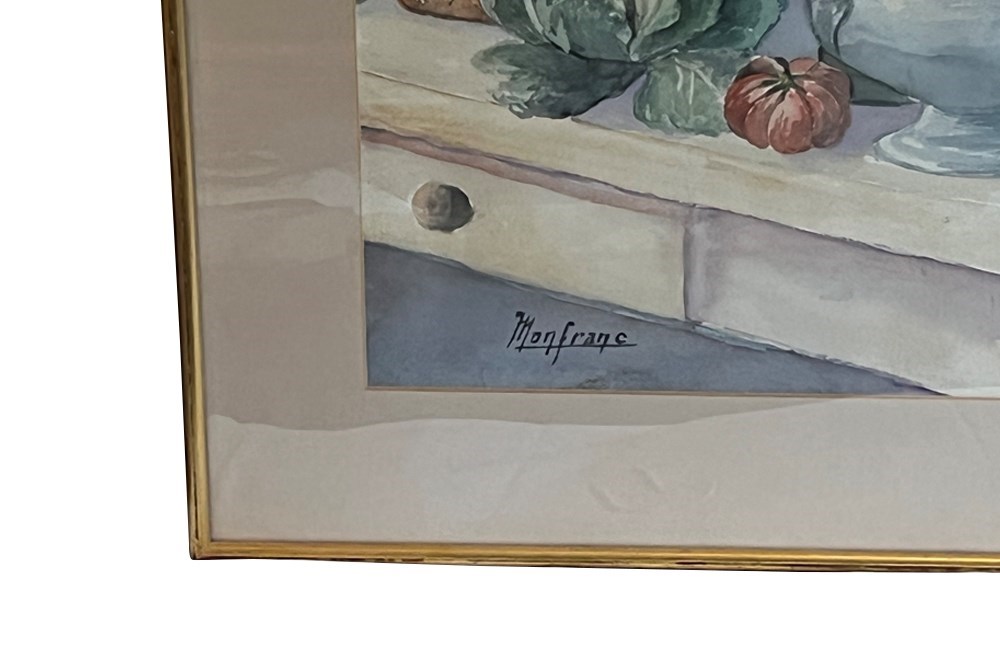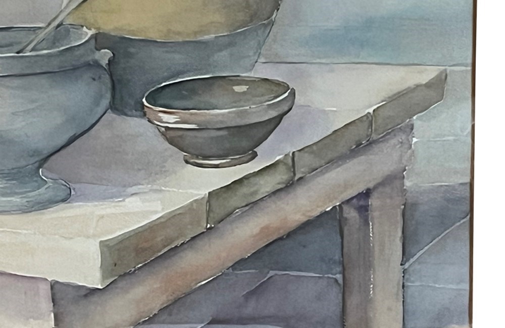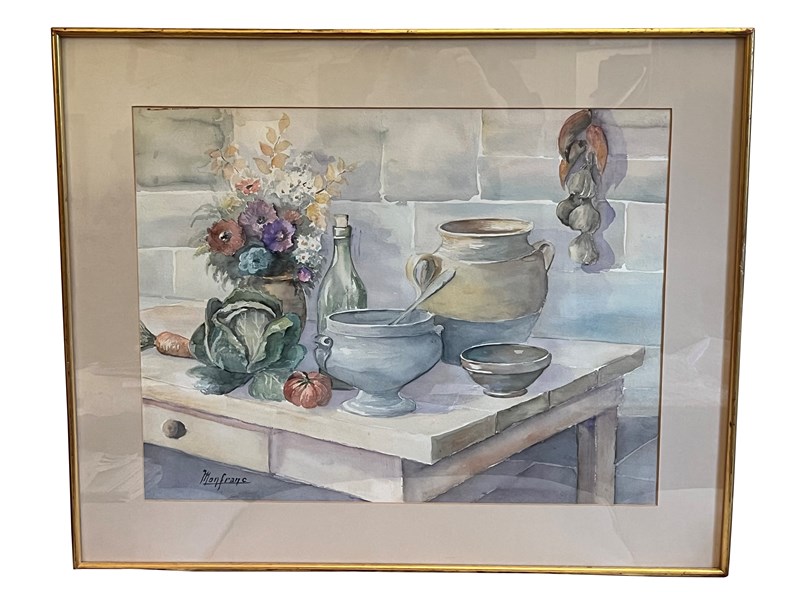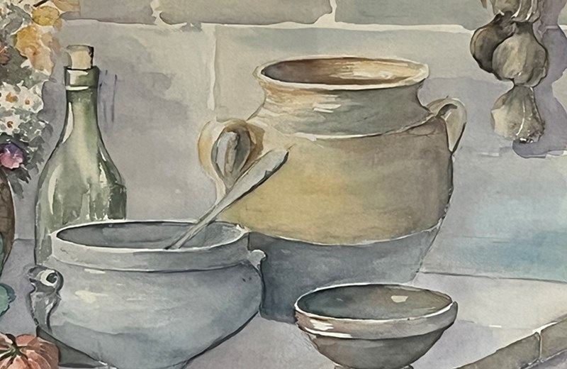 Large 20th Century still life watercolour of a a kitchen table with confit pots, flowers, tureen, bowl and vegetables.
