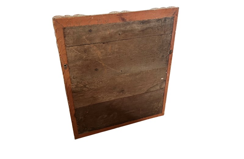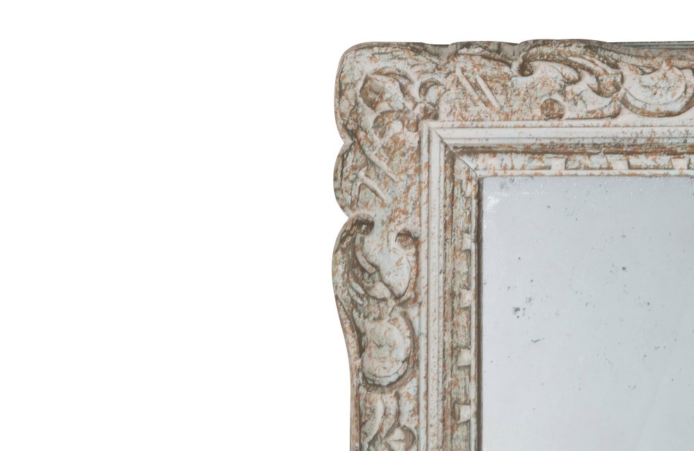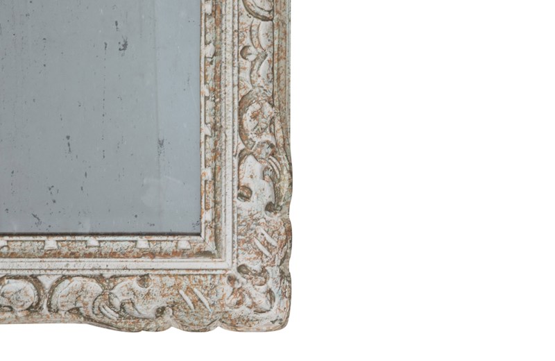 With lovely old foxed mirror glass and Montparnasse carved frame with original paint and patination.