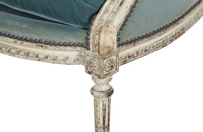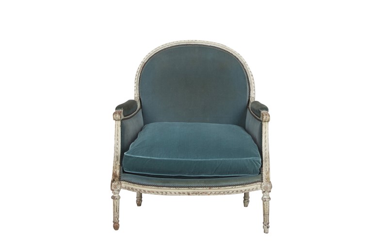 This elegant French bergere retains its lovely soft blue velvet upholstery and feather filled seat cushion. It has wonderful patina and atmosphere.