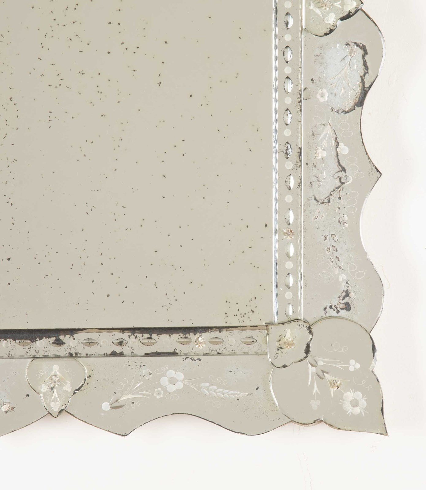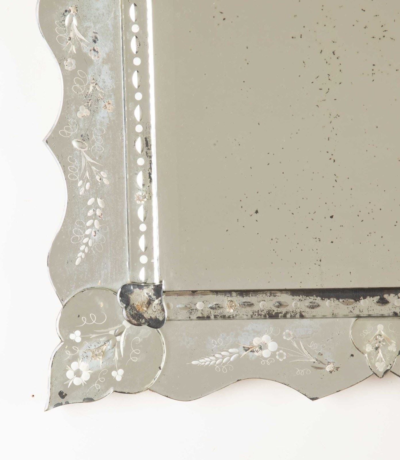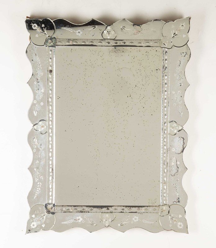 Featuring an etched and bevelled glass frame with softly scalloped edges and applied floral glass details. Engraved pretty floral motifs and layered glass elements. Lovely foxing and wear to the glass adding depth and character.