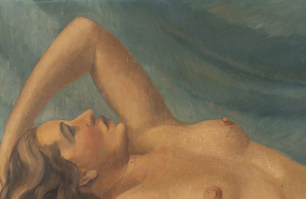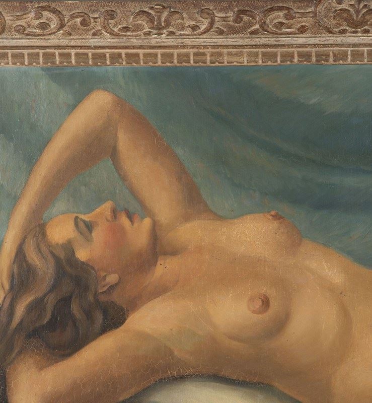 A striking large-scale reclining nude from the Montparnasse ateliers of the early 1930s Paris, signed and dated 1932. The composition captures the enduring appeal of the Paris School nude, with its softly modelled figure, warm tonal palette and relaxed, intimate pose. Painted with a confident, painterly hand, the work reflects the continued influence of the academic tradition, reinterpreted through the more fluid and decorative sensibility characteristic of independent studio artists working in Montparnasse during the interwar period. The rich drapery and harmonious colouring give the piece strong decorative presence, particularly at this scale.