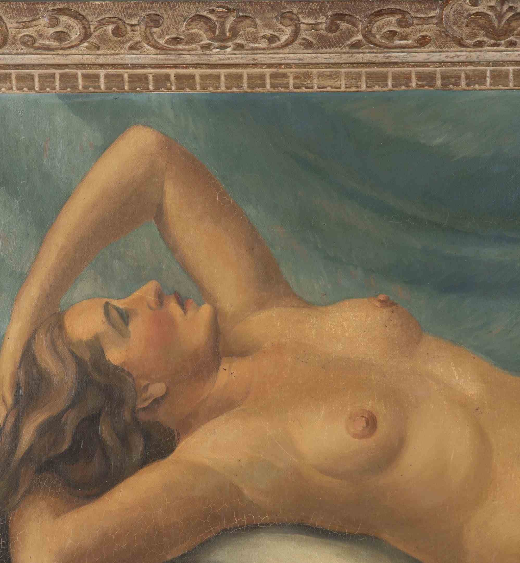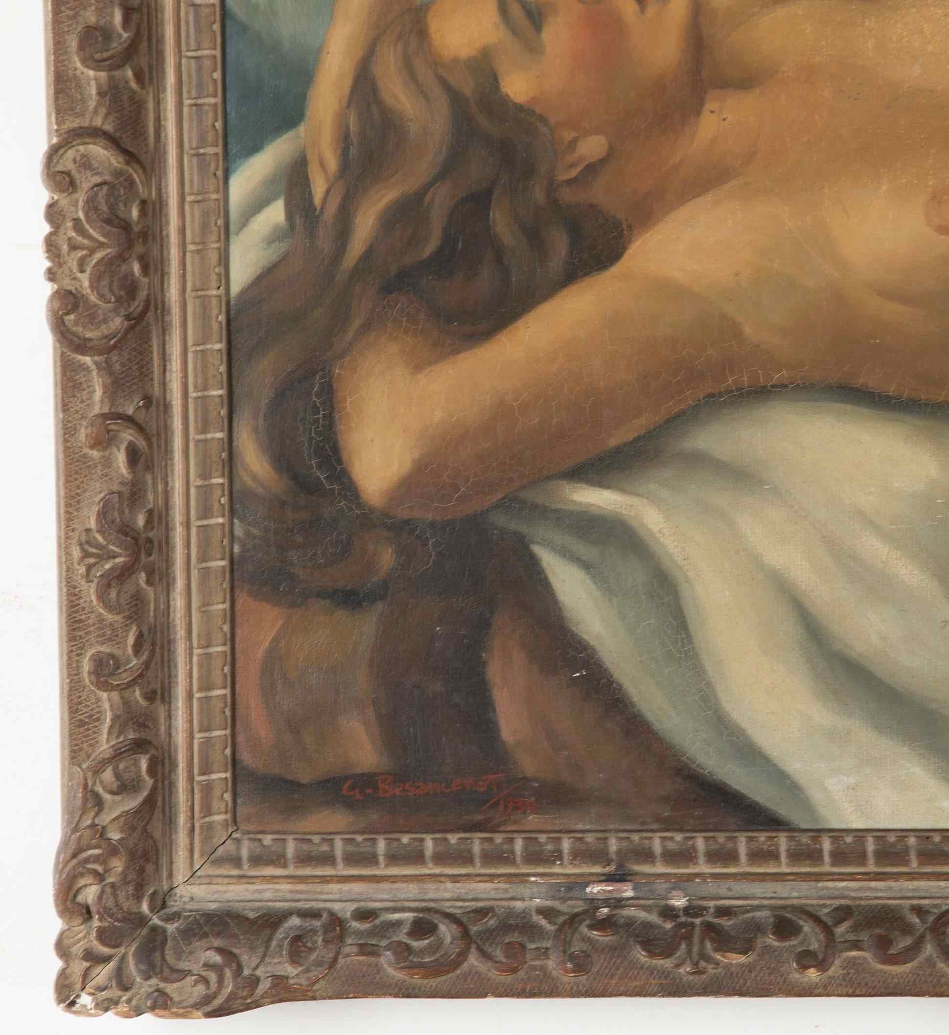 Large 20th Century French School Montparnasse reclining nude painting, signed G. Besancenot and dated 1932.