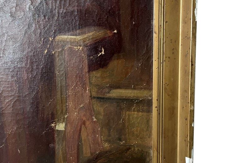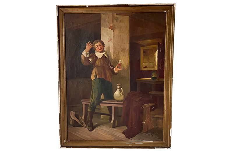 Charming painting of a jolly gentleman enjoying a glass of beer or cider in a country inn.