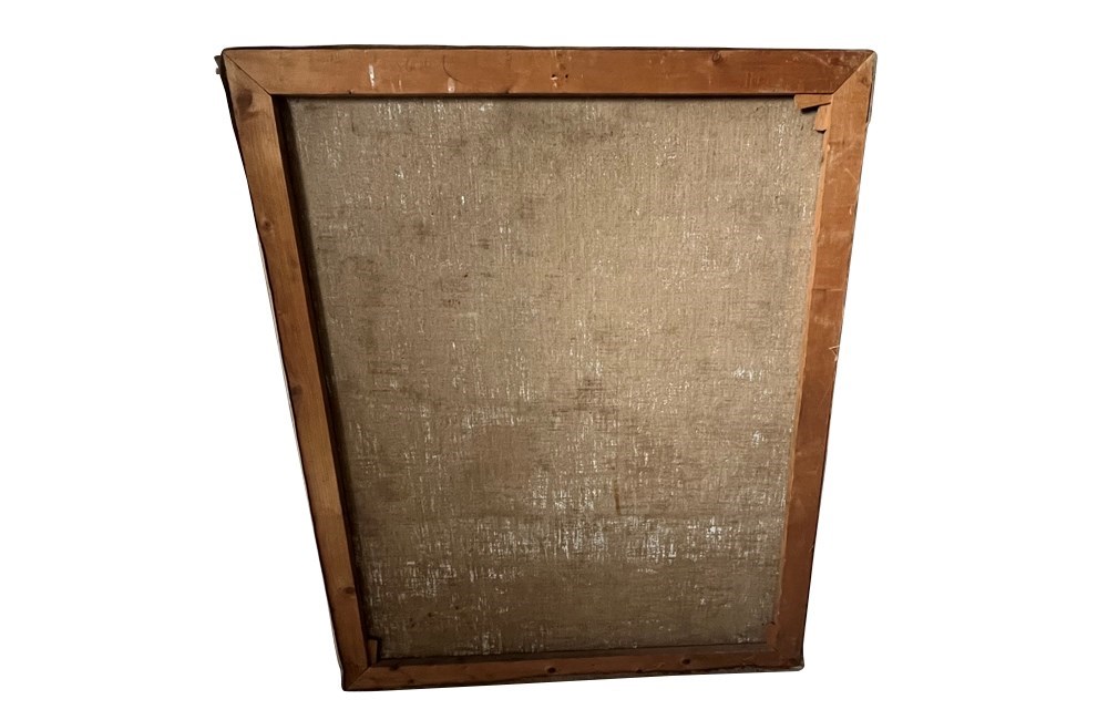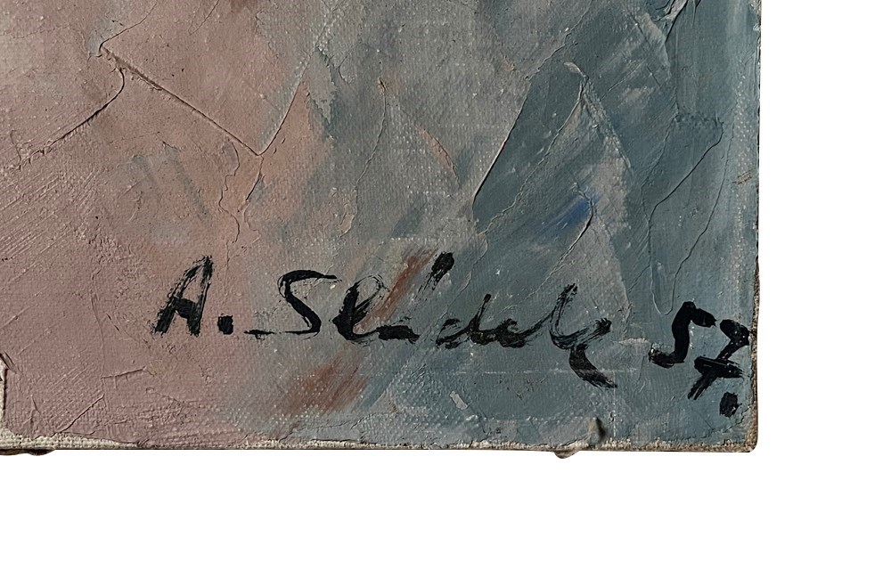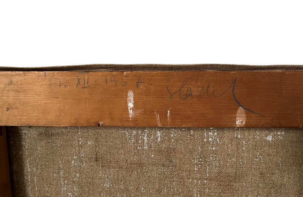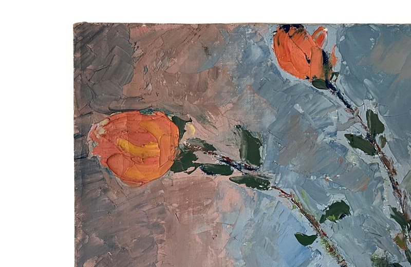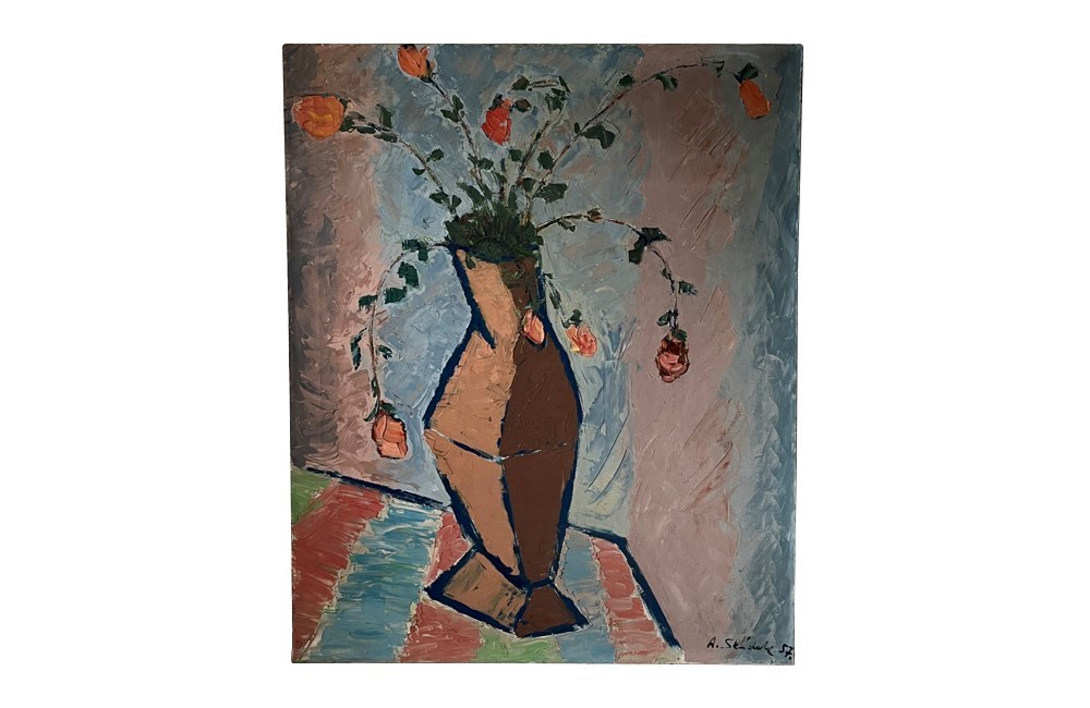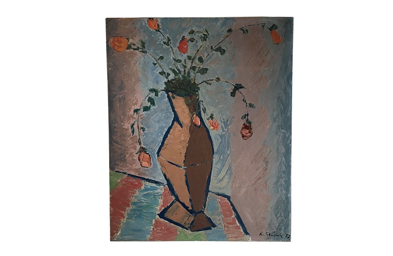 Large still life painting of a stylised vase with roses. Signed to the lower right by the artist and dated 1957.