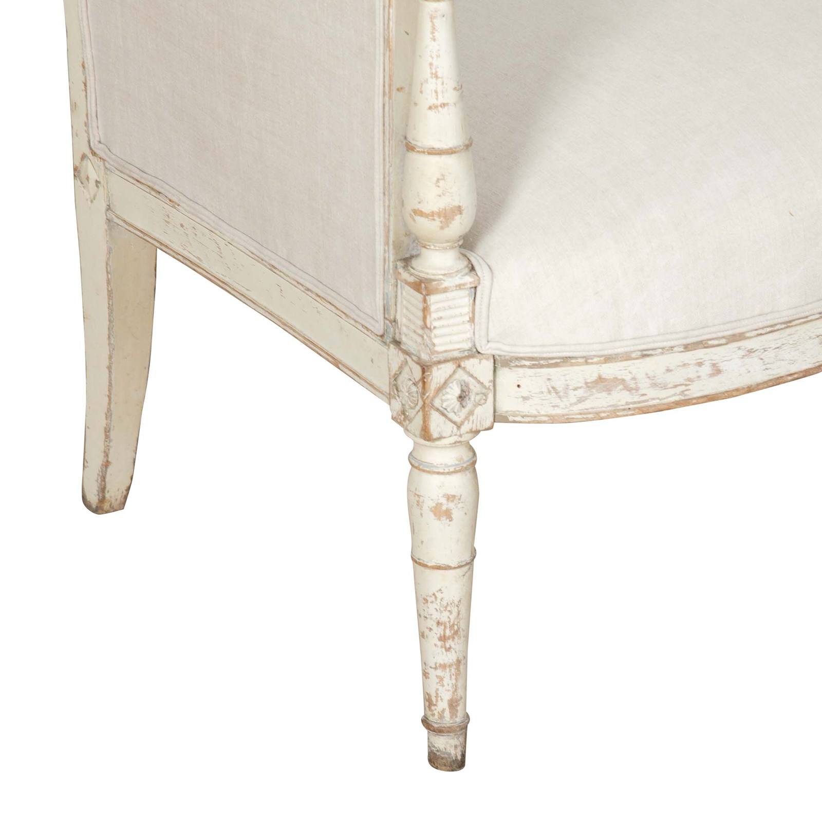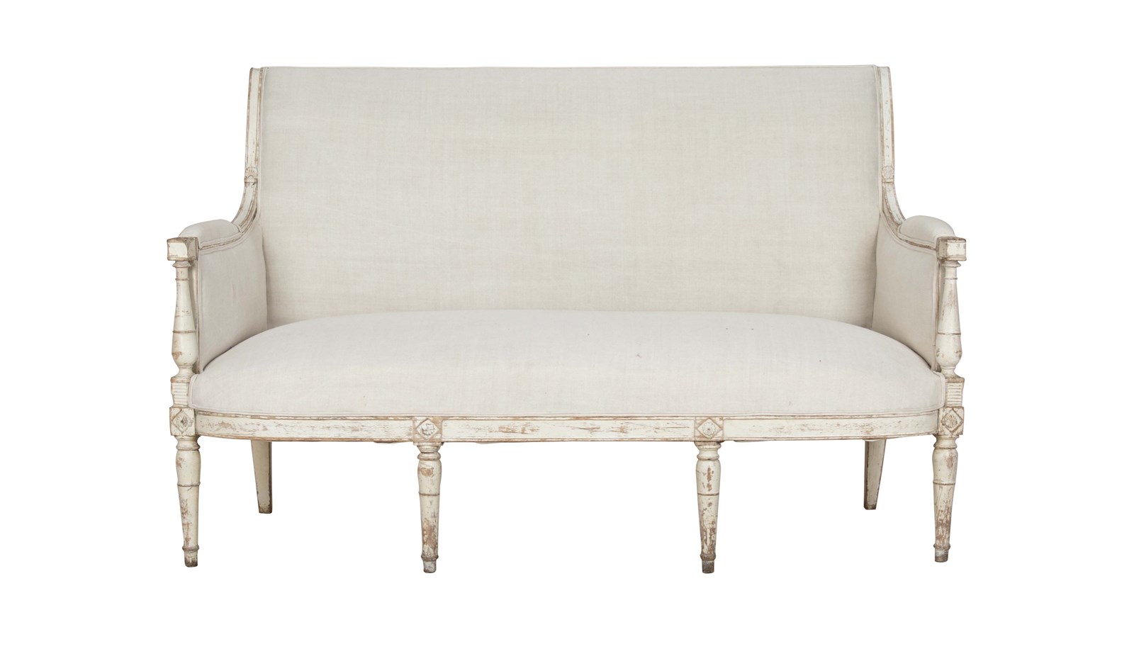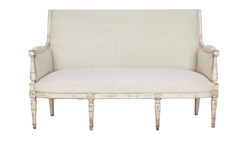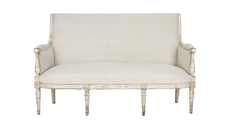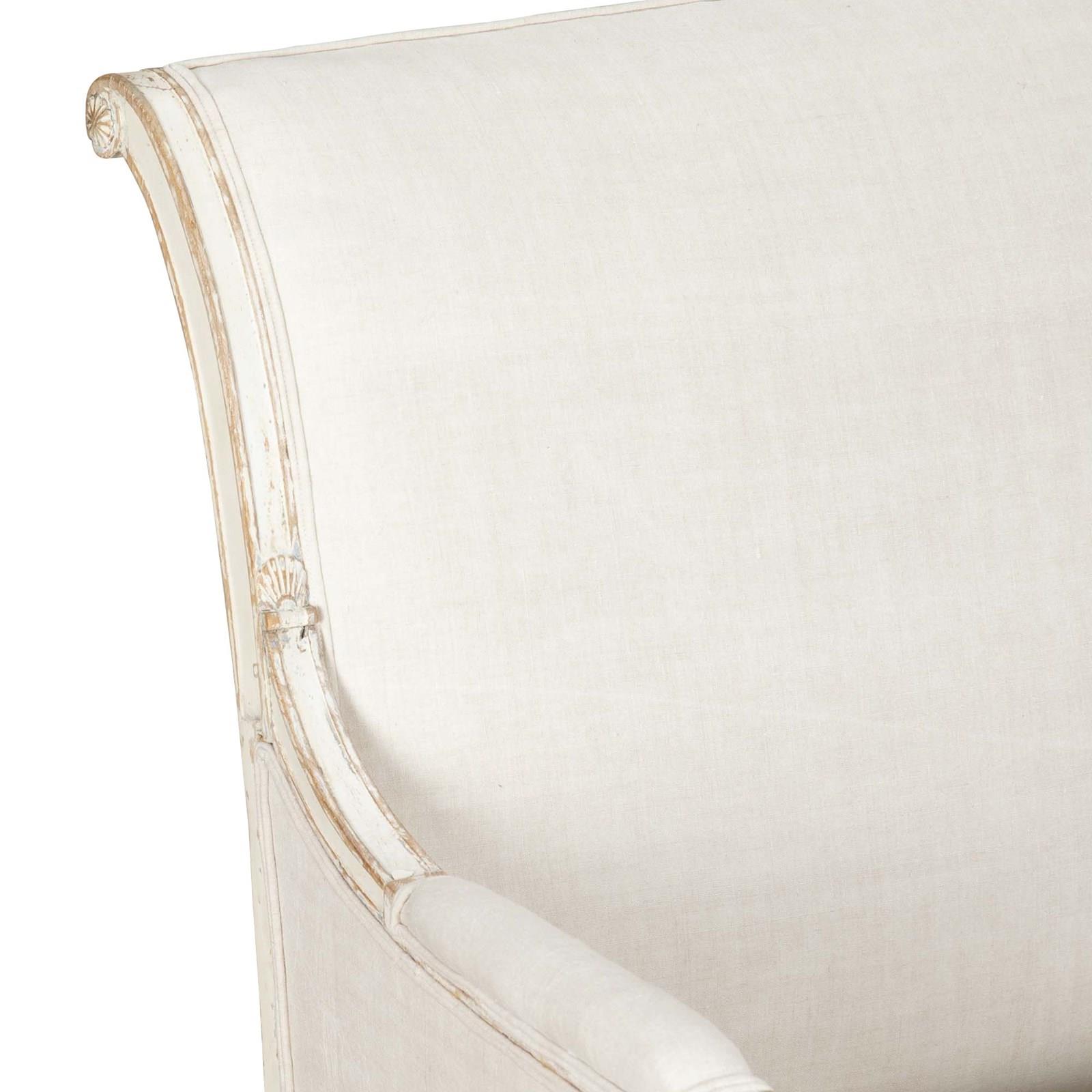 Clean, architectural lines and restrained ornamentation embody the transition from the opulence of Louis XVI to the more disciplined aesthetic of the Directoire era. Circa 1800. The sofa features a solid wood frame with tapered legs, subtly carved with classical detailing. It has been upholstered in beautiful antique linen that complements the piece’s historic character. The upholstery is finished with double piping, providing a tailored and sophisticated edge that highlights the crisp lines of the seat and back. The painted frame shows time-worn patina and gentle wear consistent with age. These signs of use reflect the canapé’s history and add warmth and authenticity to the piece, enhancing its antique character rather than detracting from it.
