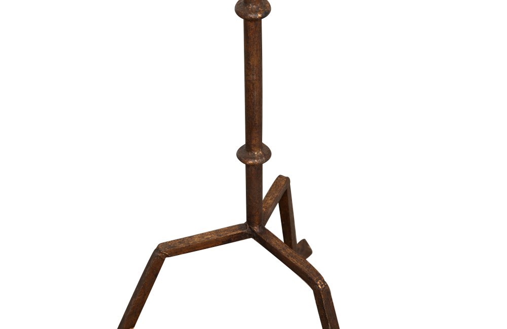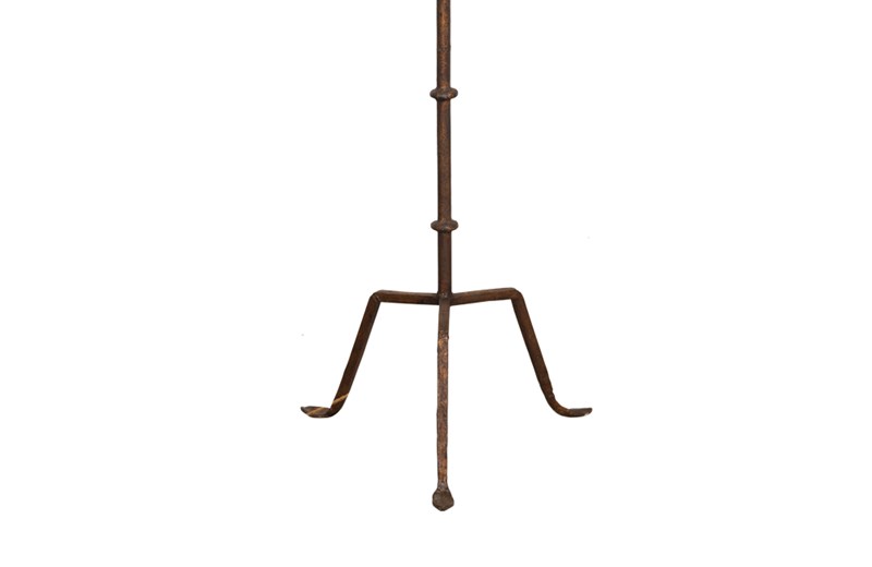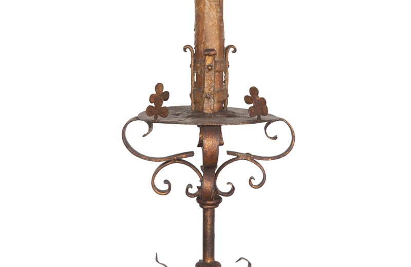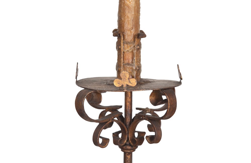 The wax faux candle light fitting sits in a circular cage atop a round plate with four trifoliate decorations and scrolling ornamentaion to the underside.The ringed stem features foliate decoration and an angular tripod base terminating with arrow point feet.