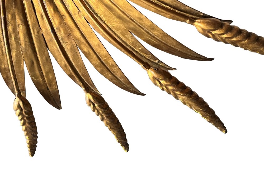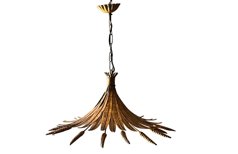 Elegant Mid-Century French gilt metal hanging pendant light in the form of a wheat sheaf.