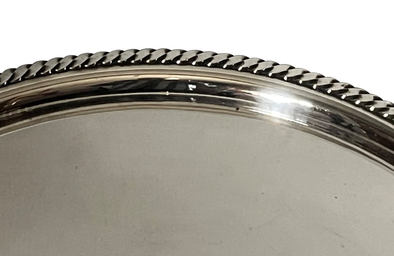 With folding metal tripod stand with central ring. Round tray with rope twist rim.