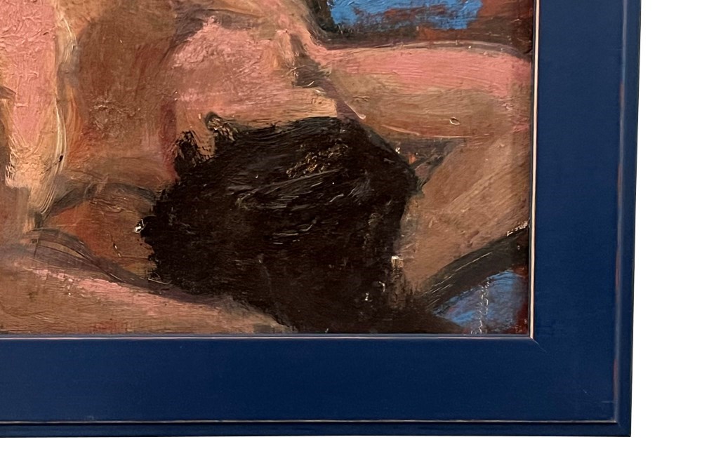 Mid-Century French oil on board of a reclining female nude.
