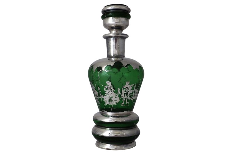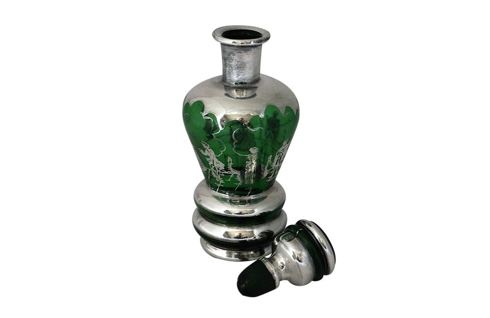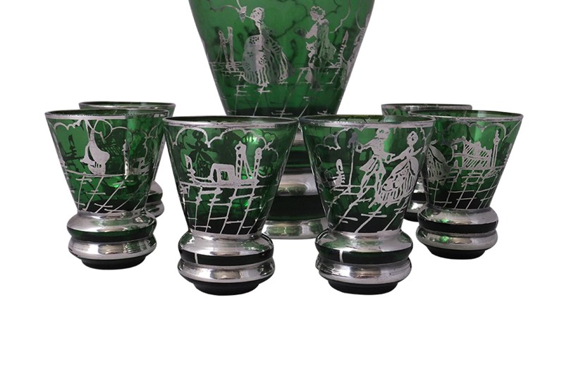 Pretty, green Murano glass liqueur service with silver overlay. This chaming set comprises a carafe with its original stopper and six liqueur glasses. The service is decorated with romantic Venetian scenes including gondolas, musicians and dancers. The stopper has a pretty floral motif to the top. A beautiful addition to any cocktail bar or dresser.