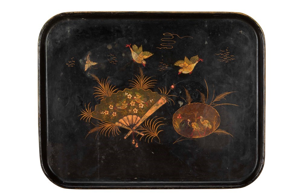 19th century black papier mache Chinoiserie tray. This charming Napoleon III tray is beautifully decorated with a fan, birds and foliate decoration