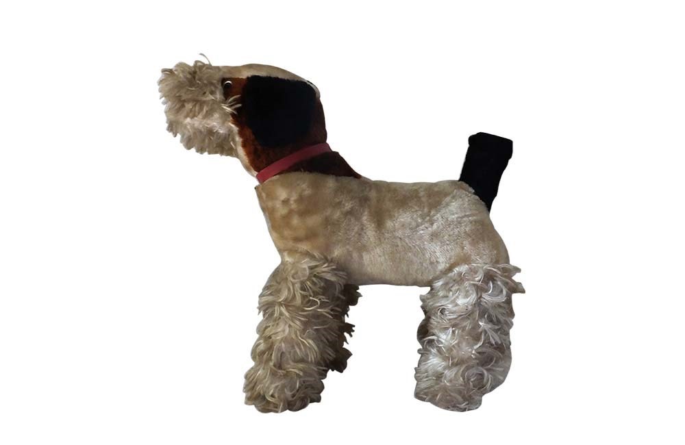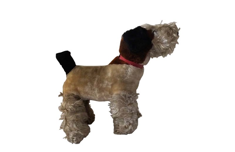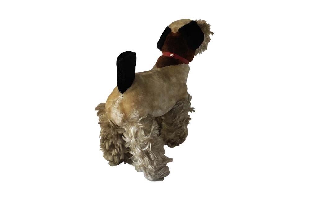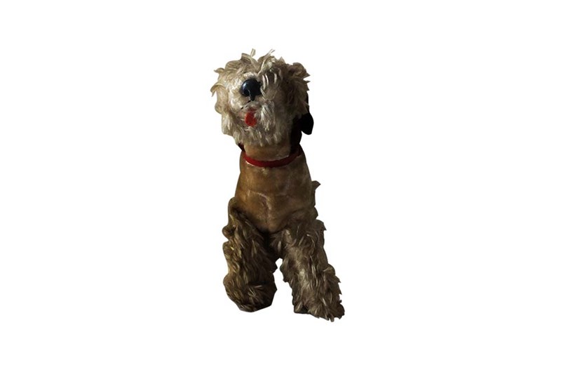 Lovely old French toy dog. This charming little fellow with glass eyes, has a fluffy muzzle and legs, upright tail and his original collar. First half of the 20th century.