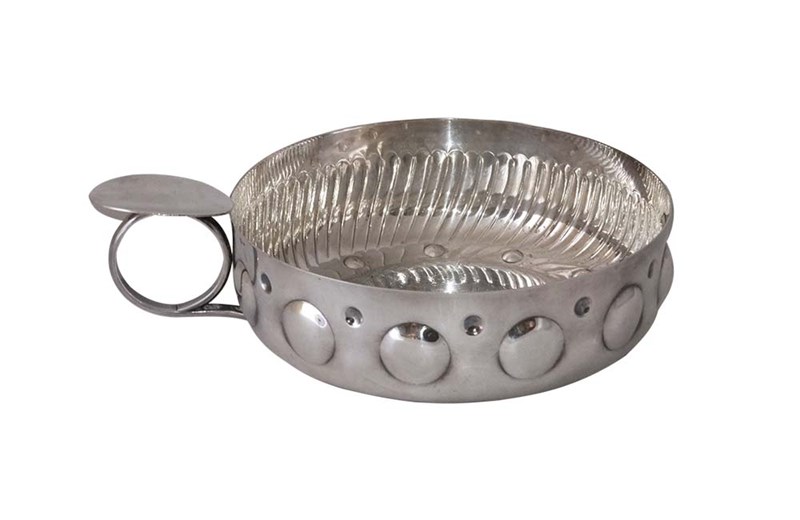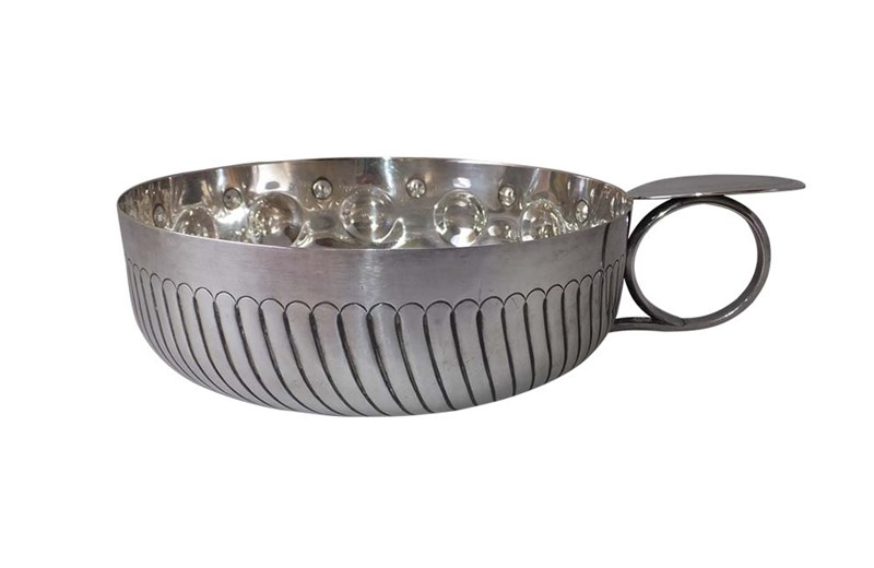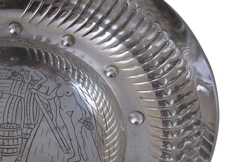 Wonderful, large silver plate dish in the form of a wine tasting cup or 'taste de vin'.