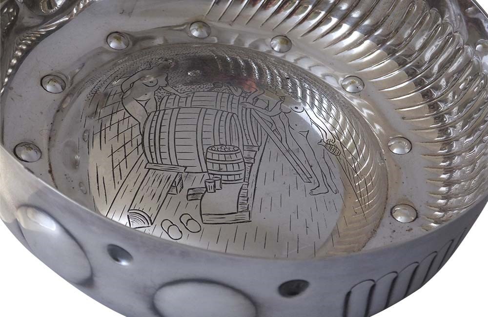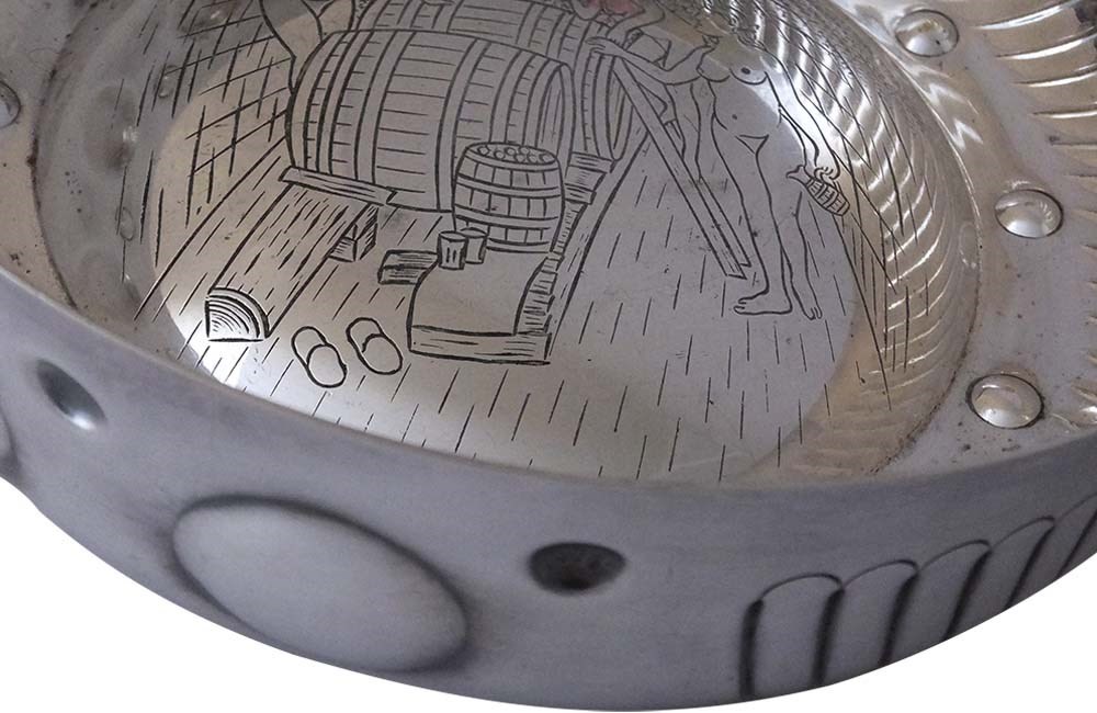 It has been decorated with an engraved amusing scene of wine barrels and three nude female figures in the process of wine tasting.