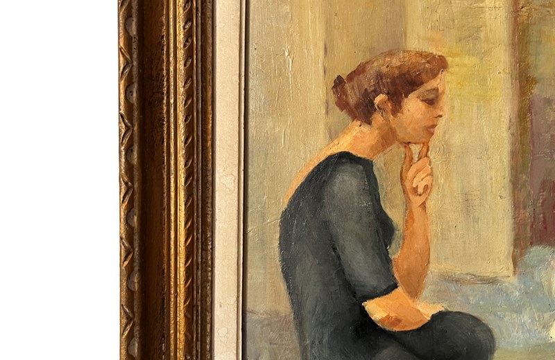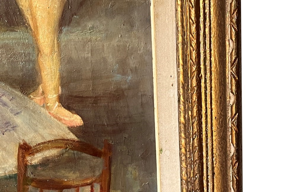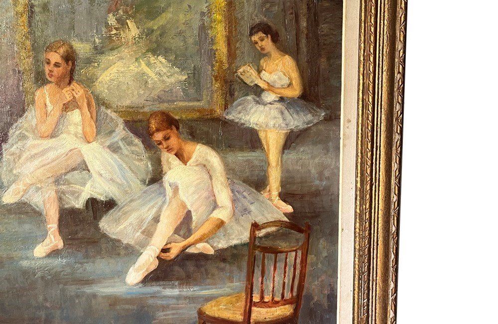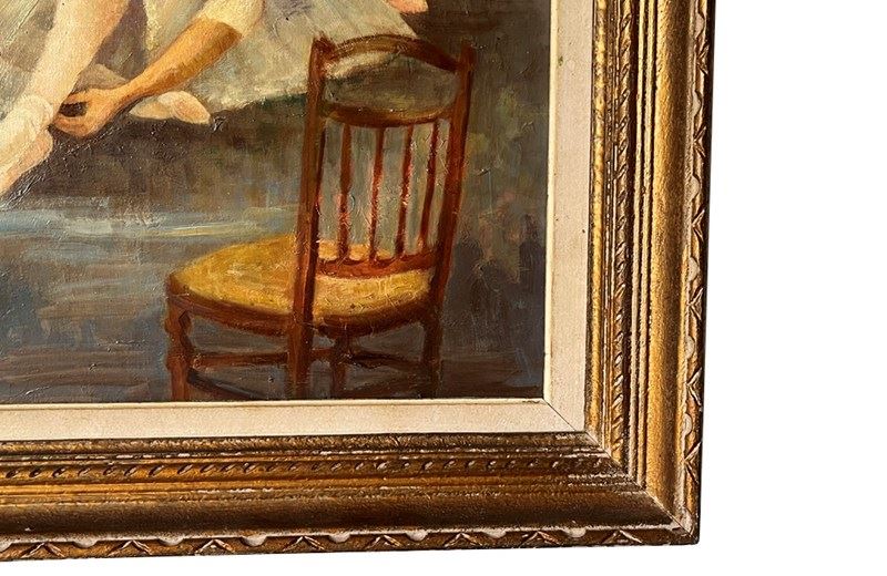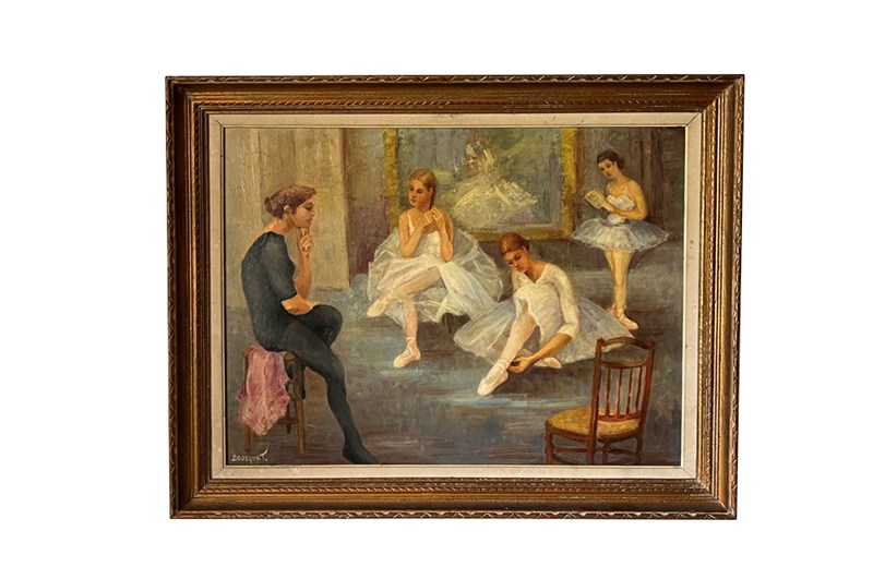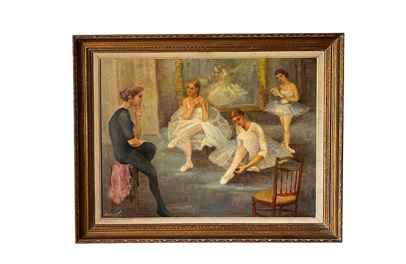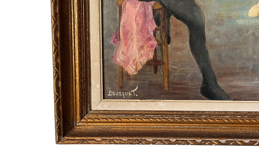 Beautifully, atmospheric 20th Century oil on wood painting of a ballet class. Signed to the lower left corner by the female artist, Bousquet. Framed in gilt frame of the period.