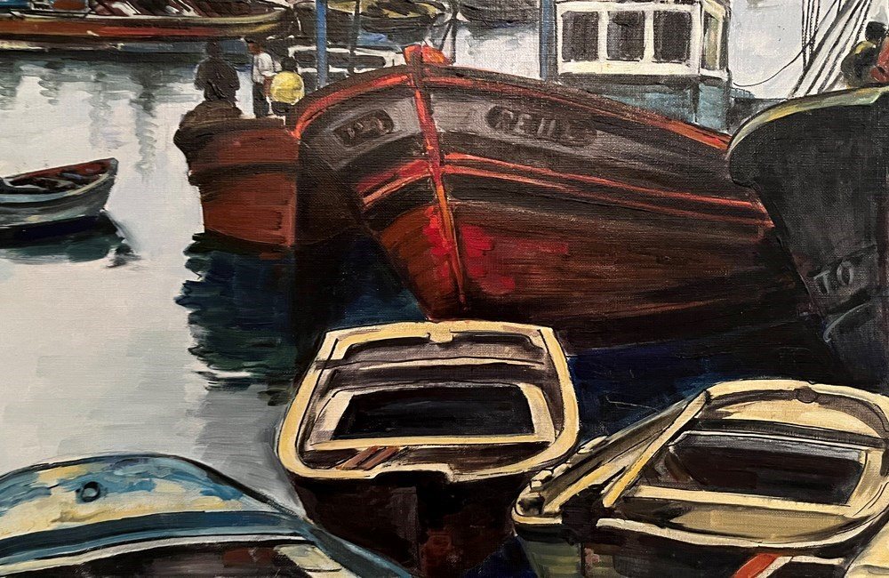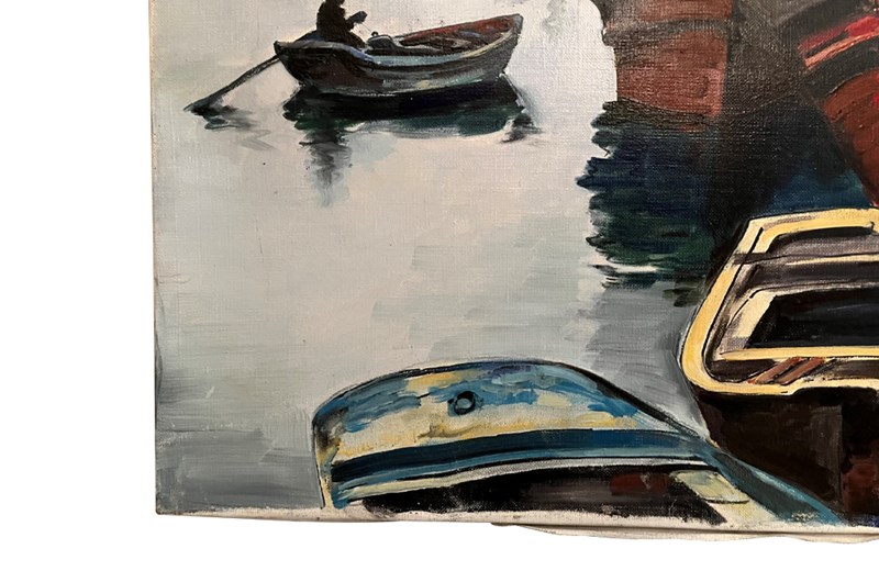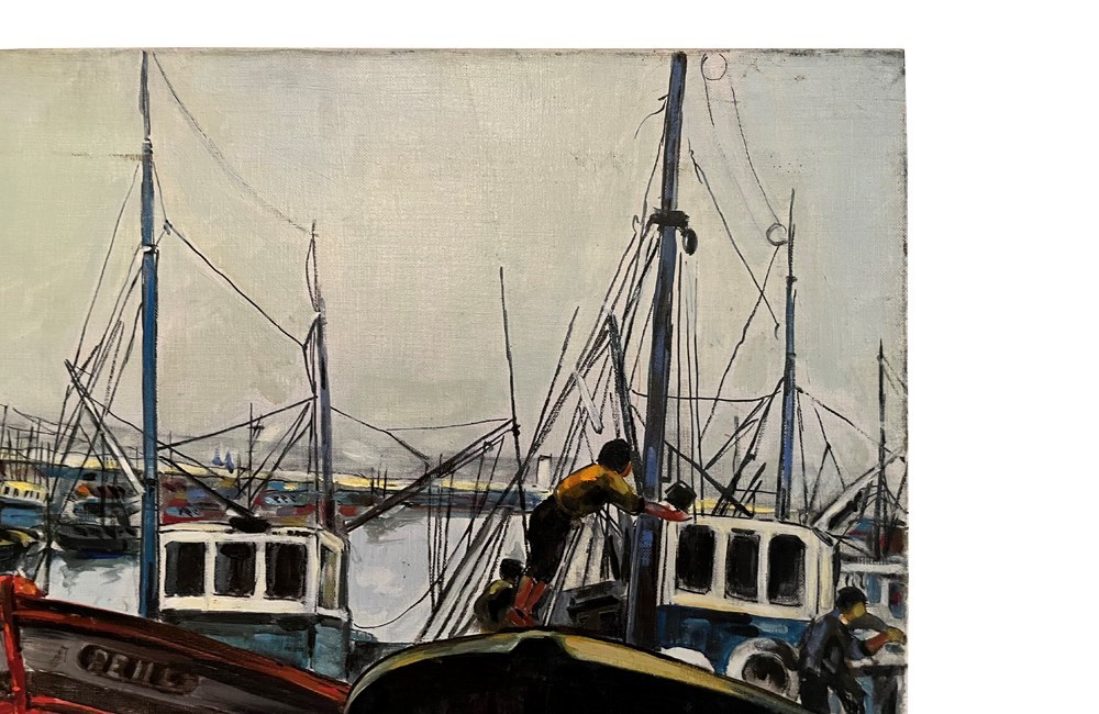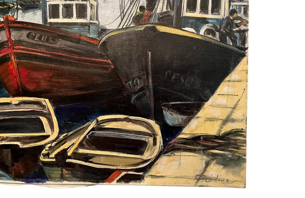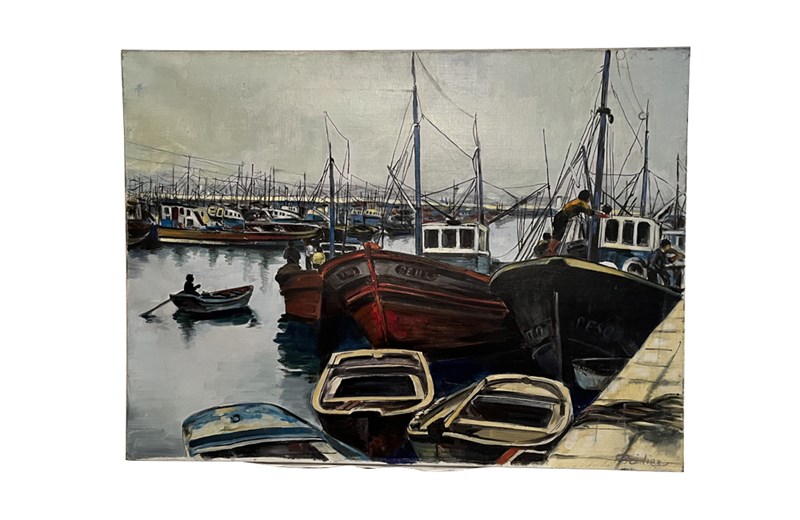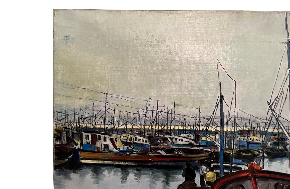 20th century unframed oil on canvas painting of the fishing Port Peniche, Portugal.