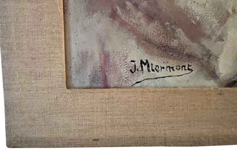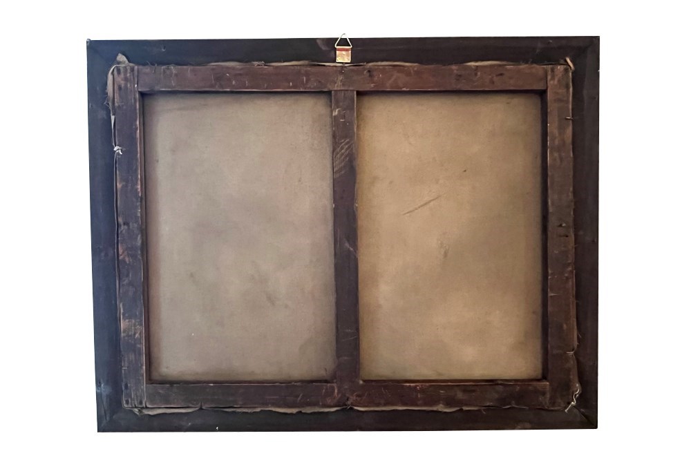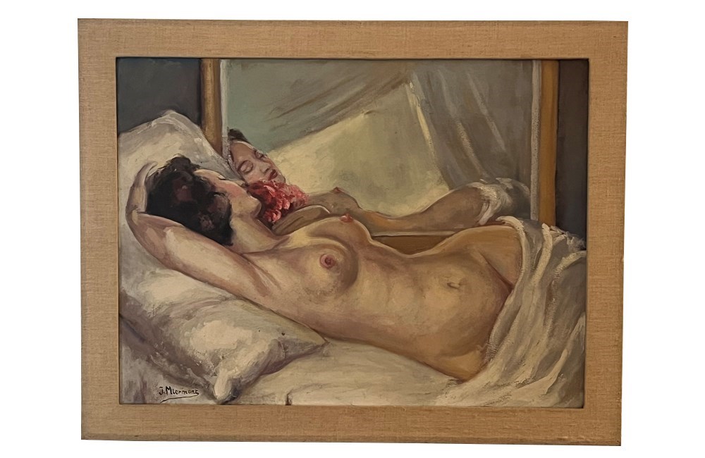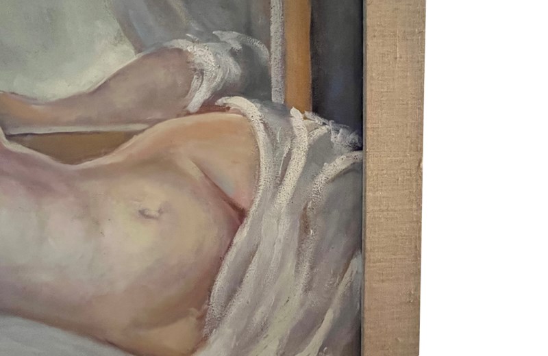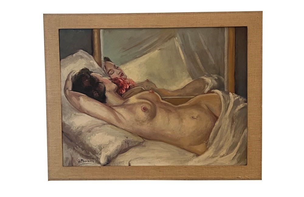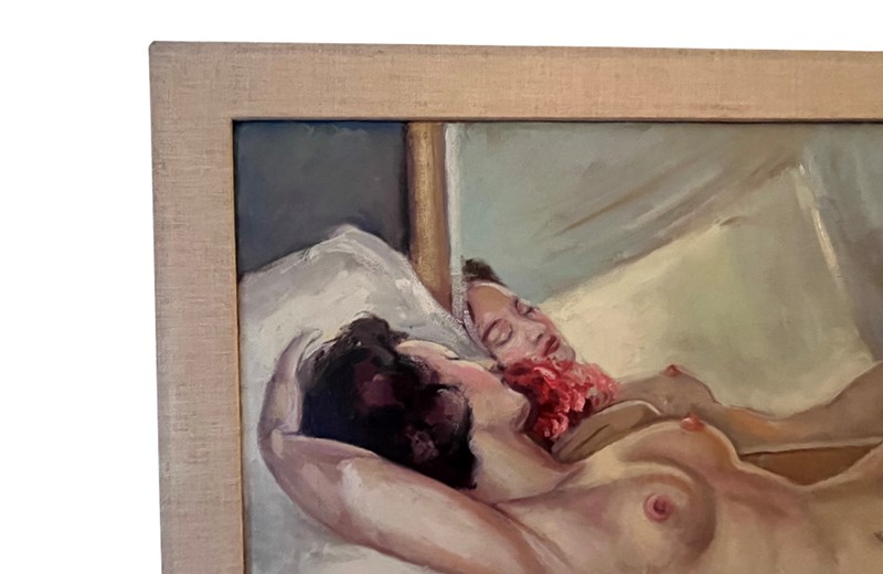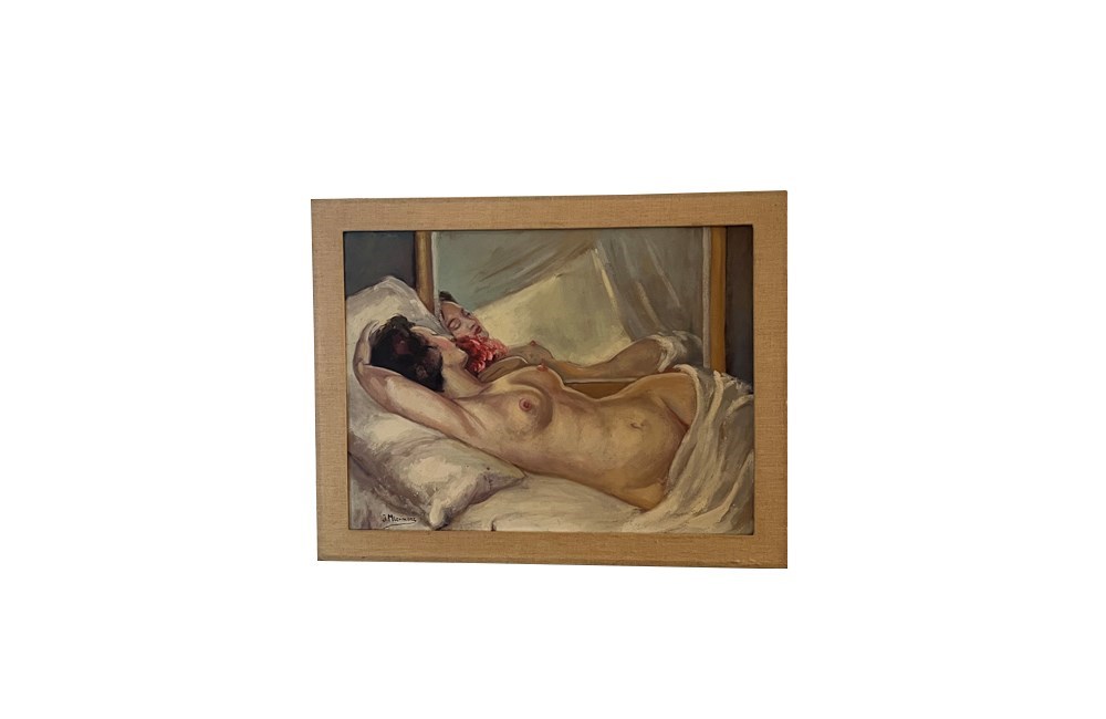 Framed oil on canvas painting of a sleeping female nude. Reclining in her bed, a rose lays by her head resting on a pillow , reflected in a mirror.