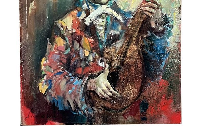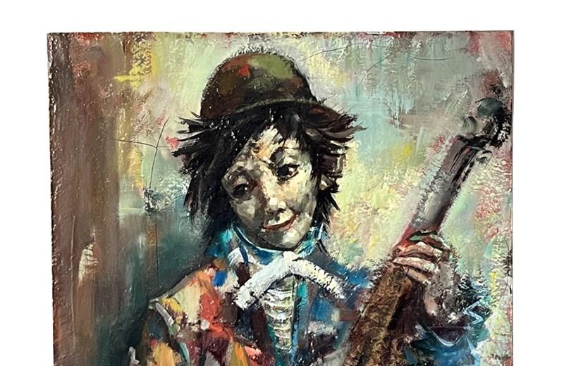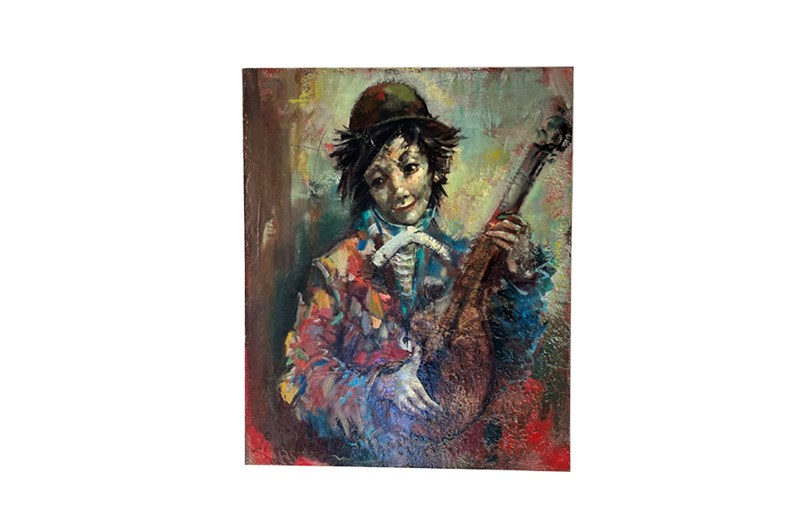 20th century oil on canvas painting of a young clown with mandolin by Marc Selva.