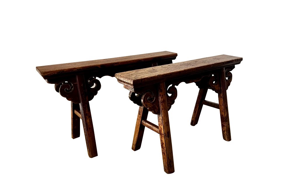Pair of 19th century elm benches from the late Qing Period. Shanxi Province.