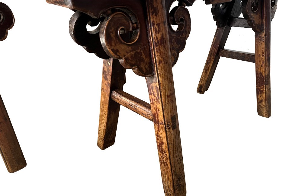 These charming stools or spring benches, (or Chung Dengs), hinting that the seat could be shared by lovers. They were typically placed to the exterior of shops outside the door. Pairs were often placed opposite each other in gateways and acquired the name 'gate benches'.