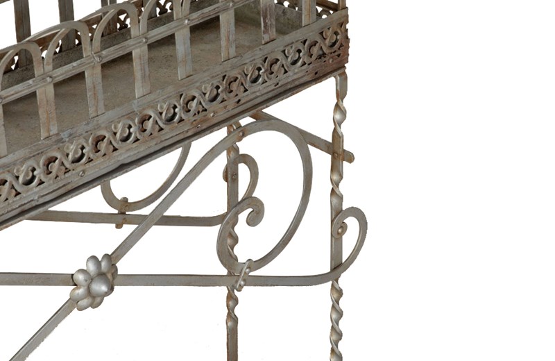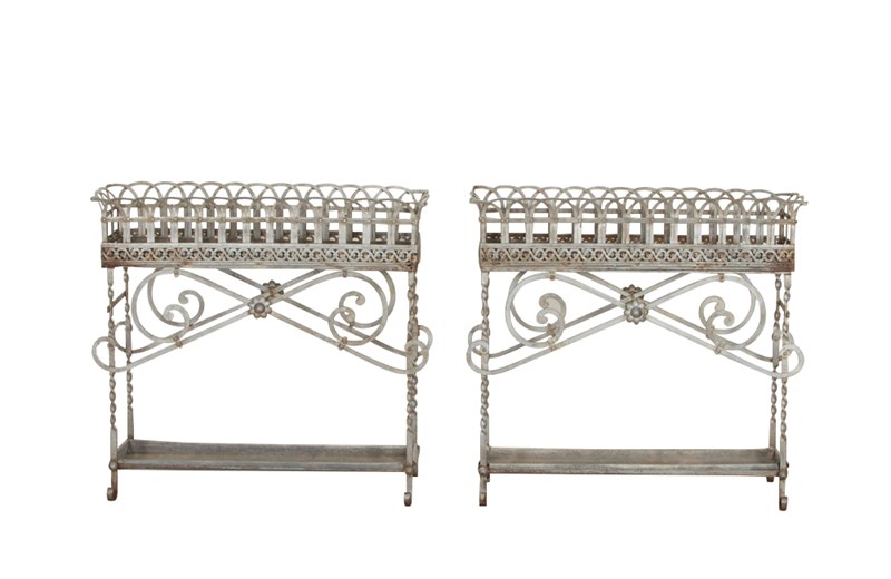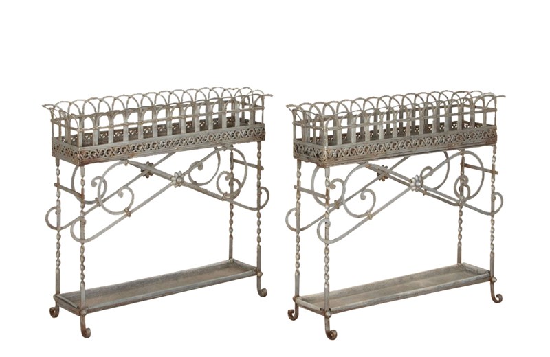 These lovely French jardinieres originate from a French summer house in Provence. Extensive, expected wear to the base of the upper baskets but their original zinc liners cover this. Also some expected wear to the fretwork, see photos for detail.