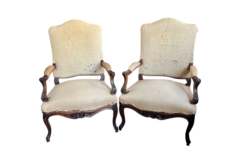 Pair of large 19th Century French walnut armchairs in the Regence style.