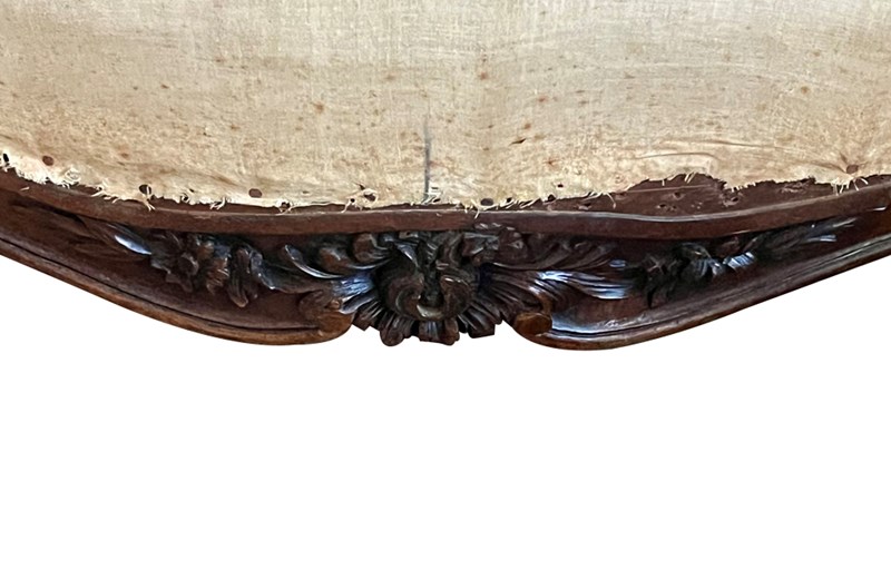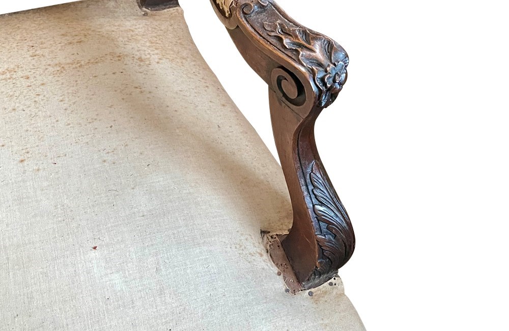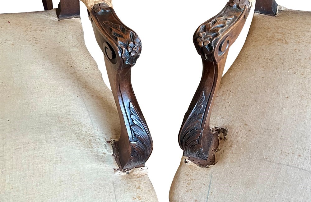 Beautifully shaped armrests and legs with lovely floral and foliate carving.