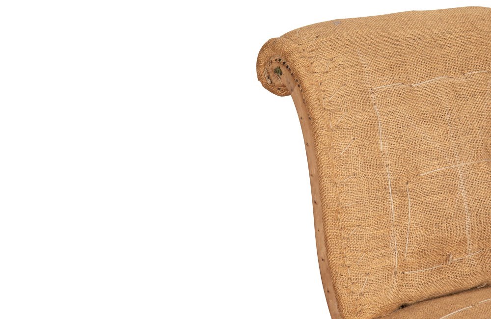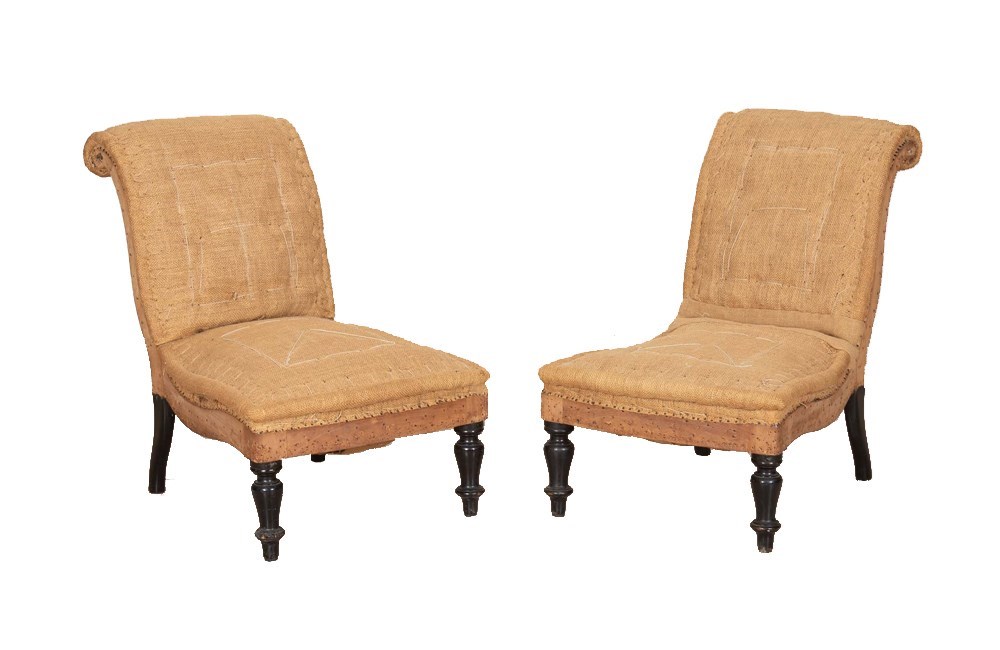 Raised on ebonised turned front legs with elegant swept sabre rear legs. The chairs are currently finished in hessian, giving them a natural, textural appearance. They are ready for covering in a fabric of choice or can be enjoyed as they are for a relaxed, understated look. Their compact proportions and graceful silhouette make these lovely chauffeuses ideal as accent seating in a bedroom, dressing room, or sitting area.