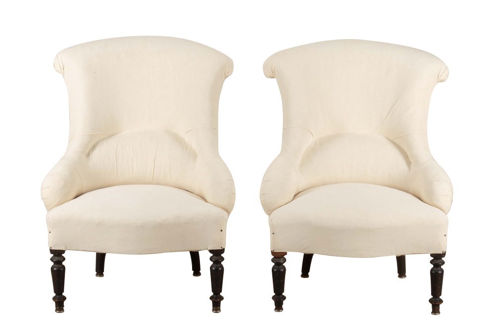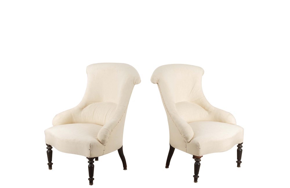 Pair of charming 19th Century French Napoleon III slipper chairs with gently curved scroll backs.