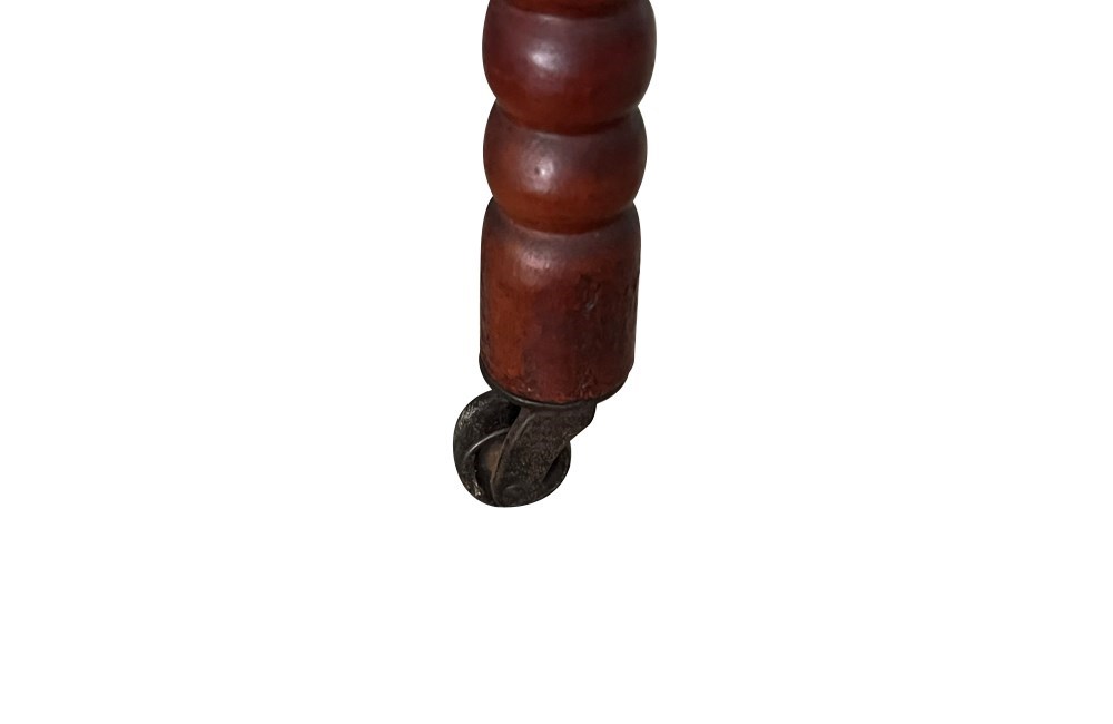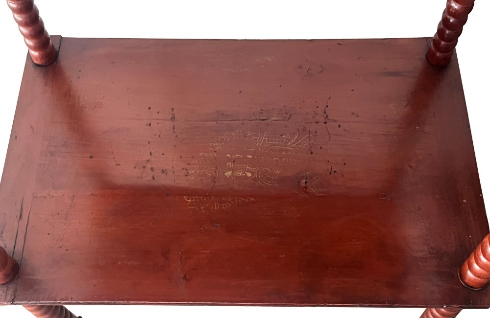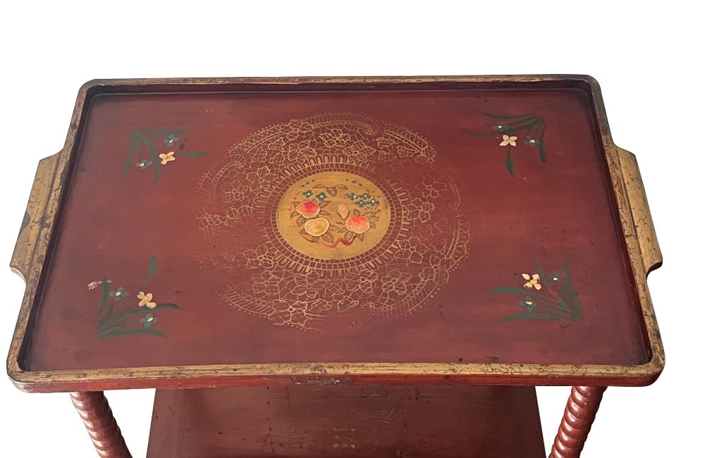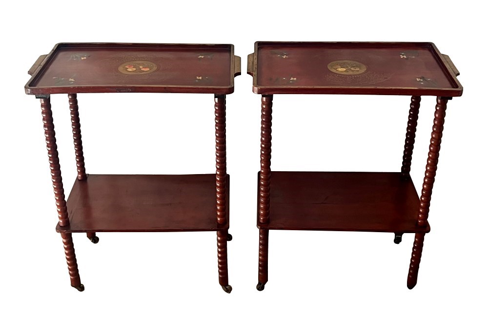 Charming pair of 20th Century Chinoiserie two-tiered bobbin side tables on castors.