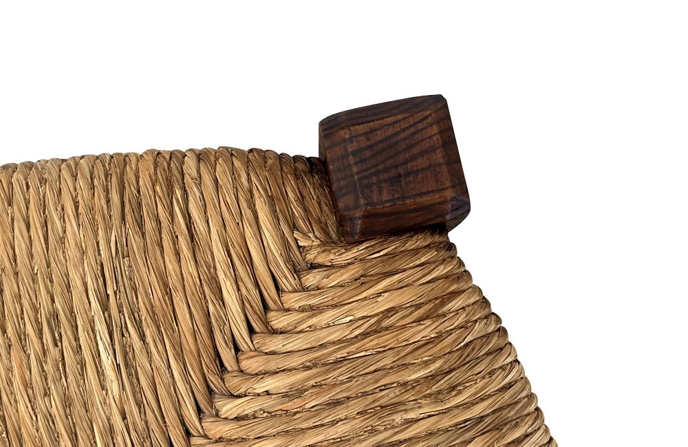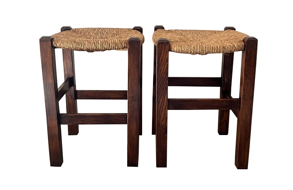 Pair of simple strawed 20th Century French country wooden stools. Circa 1960