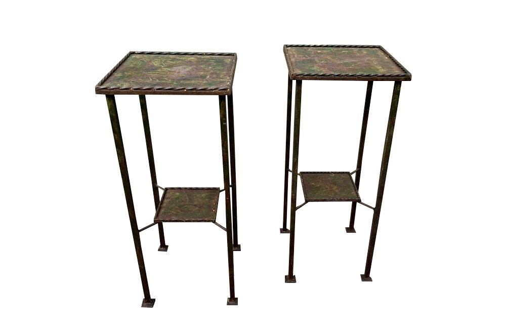 Pair of tall 20th Century Spanish two-tiered iron sellettes.