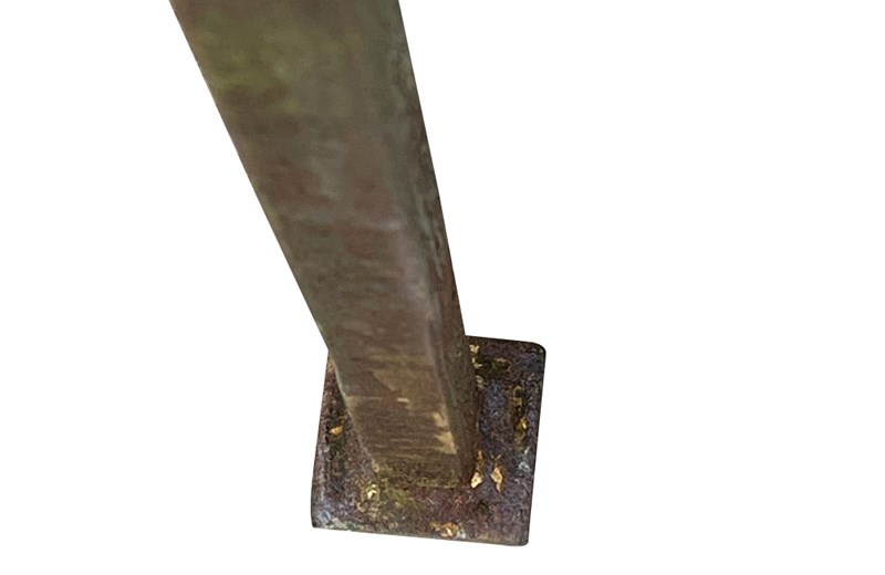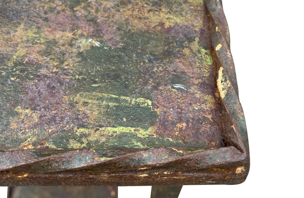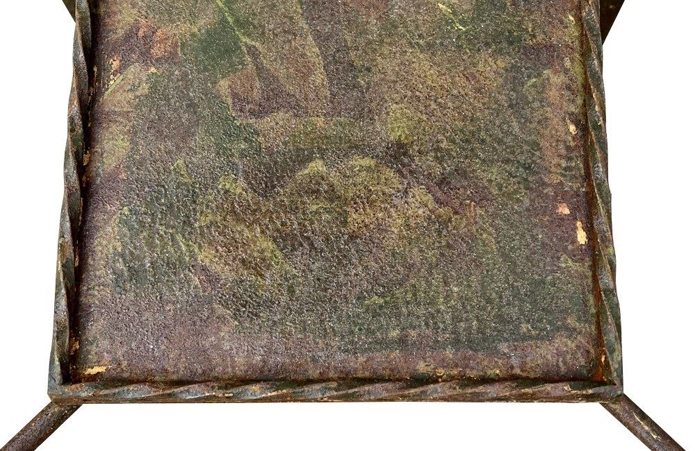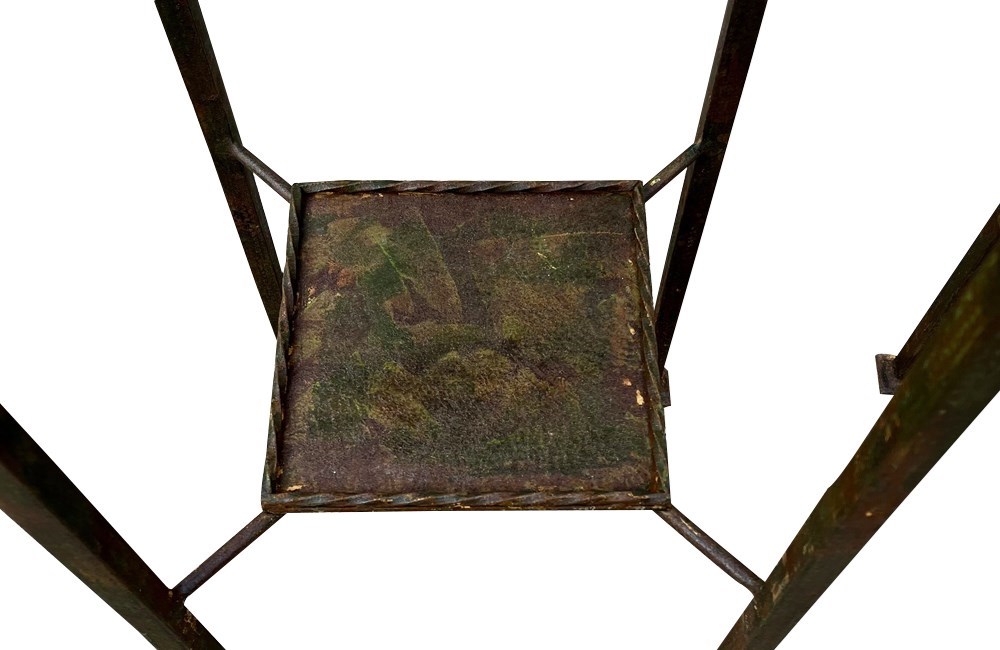 A striking pair of hand-forged iron pedestal stans with square tops framed by twisted rope edging, a hallmark of Spanish ironwork. The slender architectural bases are joined by a lower square platform stretcher, lending both balance and structural strength. The surfaces retain their original painted finish and layered patina that give the pieces strong sculptural character and depth.