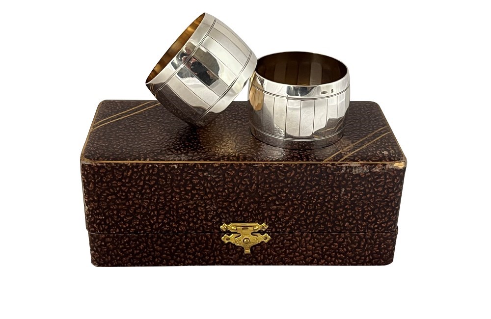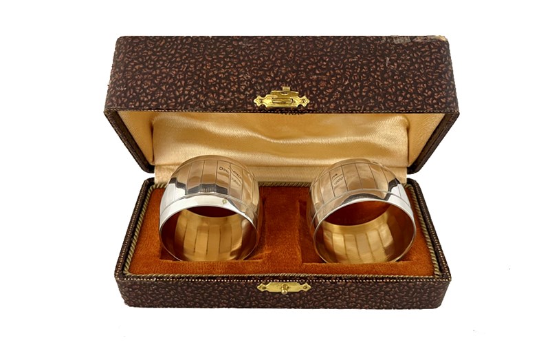 Pair of 20th Century French stylish art deco silver plate napkin rings of barrel form.