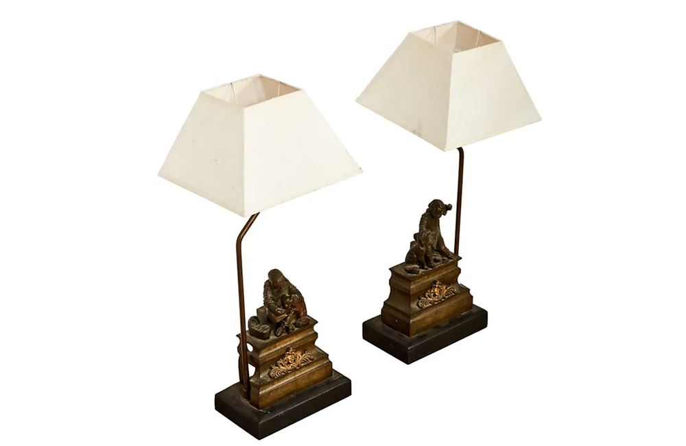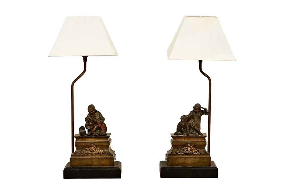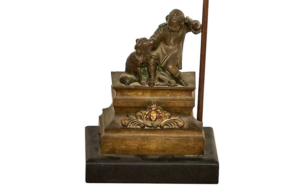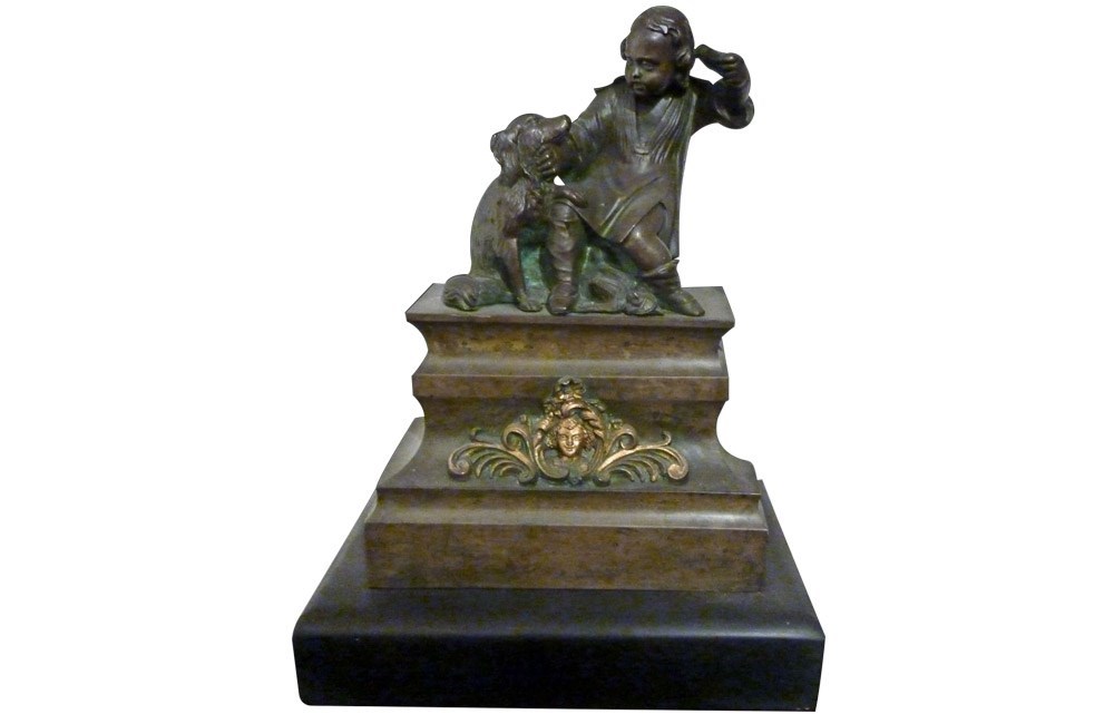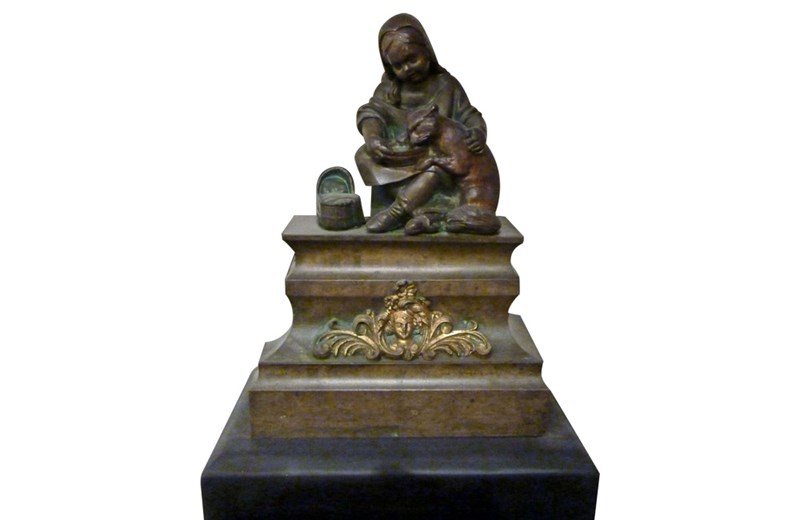 Pair of charming, 19th century bronze and ormolu figures of a young boy with a dog and a young girl feeding a cat.