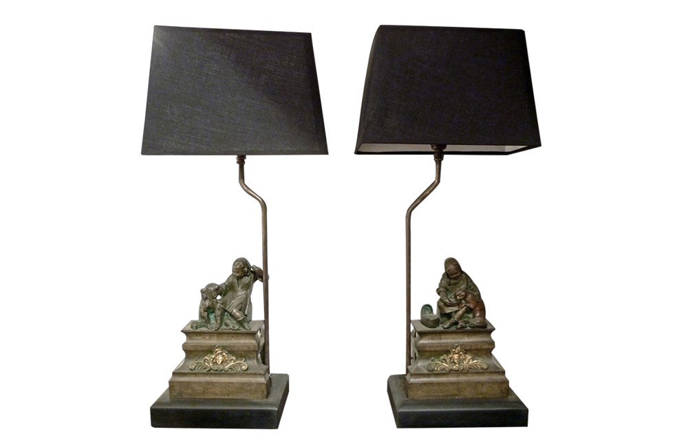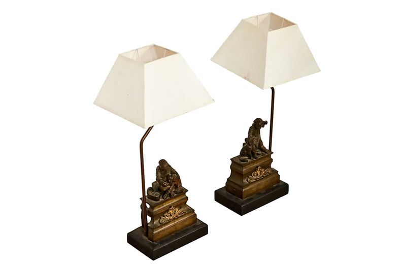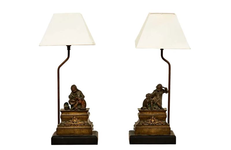 Originally from a French 'devant de cheminee', now lamped and mounted on black slate bases.