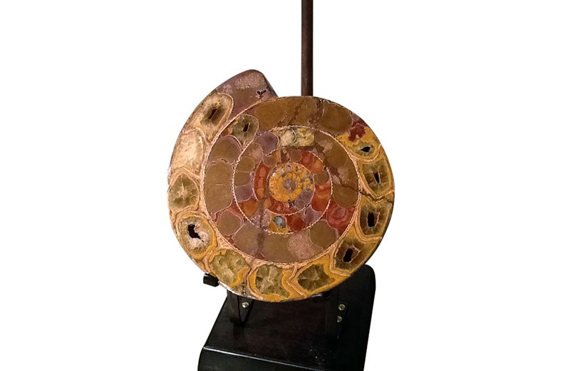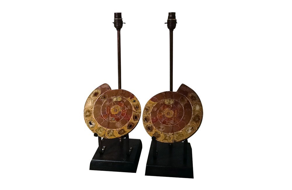 Pair of Madagascan ammonites mounted on lamped display stands.Wonderful colour.