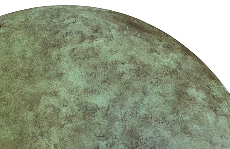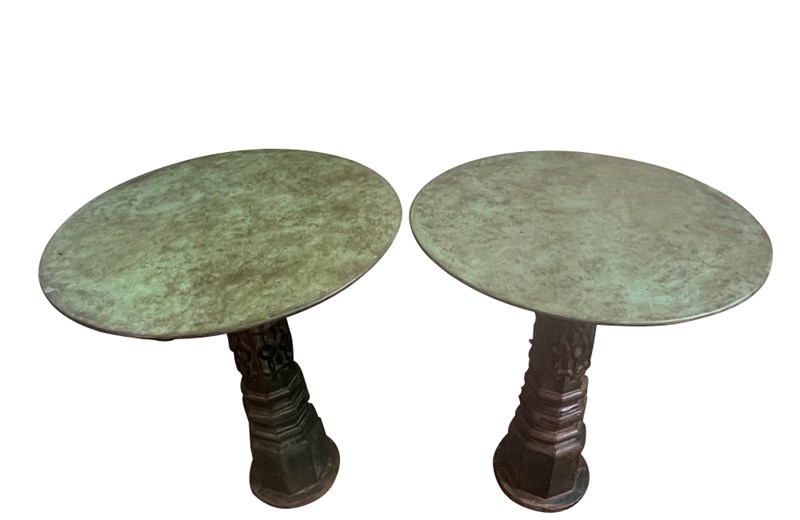 This unique pair of tables work beautifully in both interior and garden settings. The round tops have a verdigris painted finish.