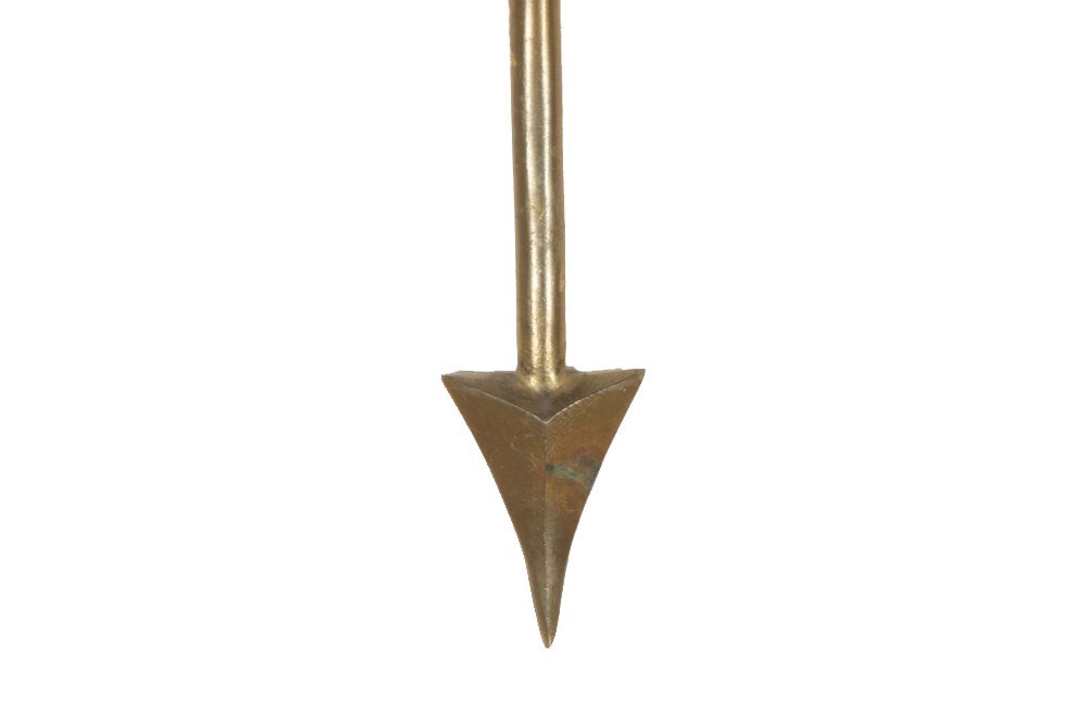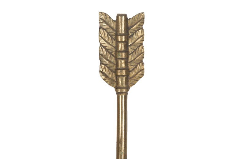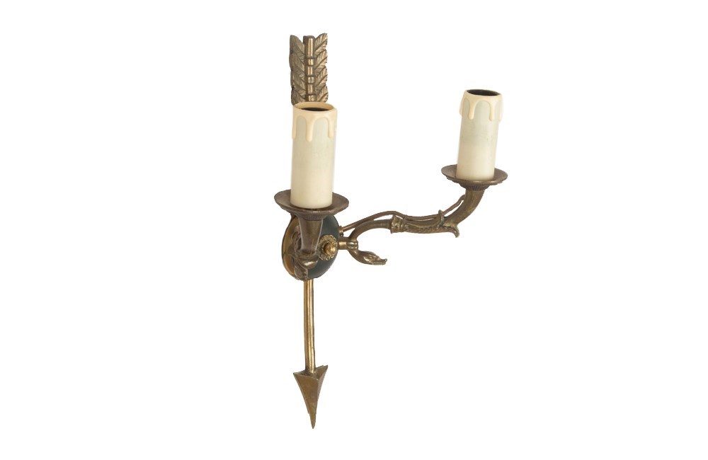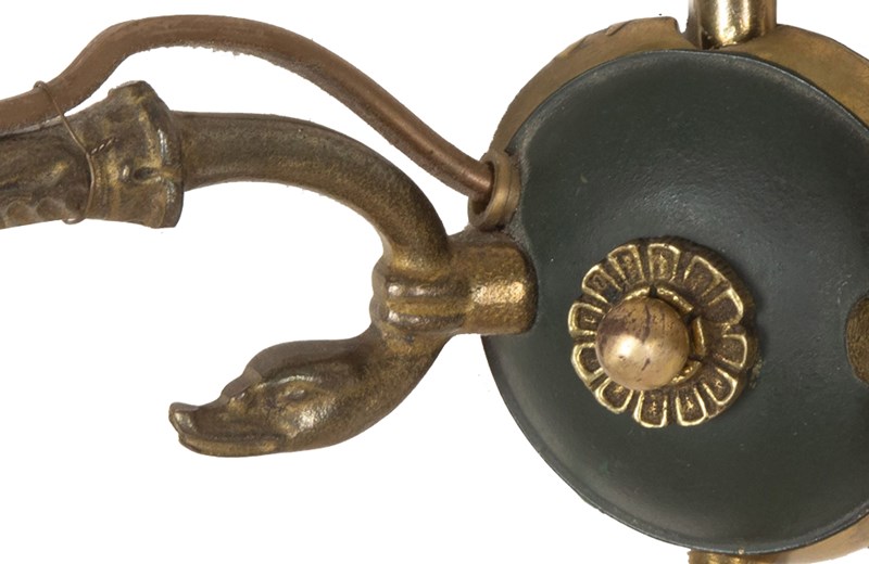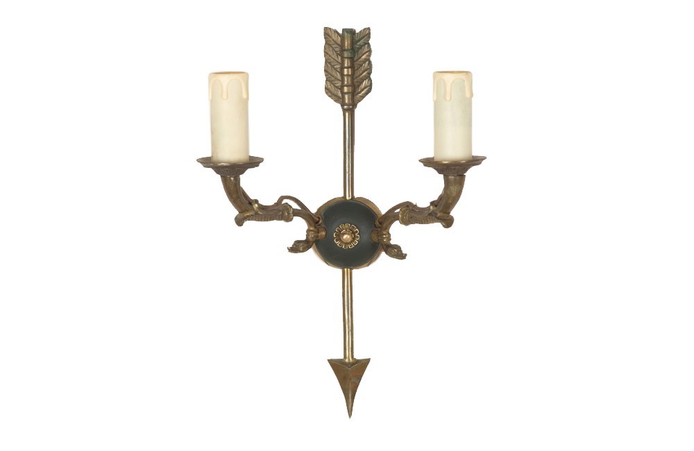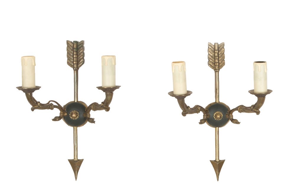 In the Empire style, these elegant wall sconces are designed as arrows. To the centre of each, is a green medallion. Each bear two branched swan neck bulb holders.