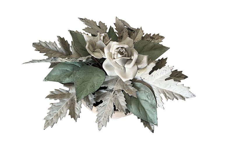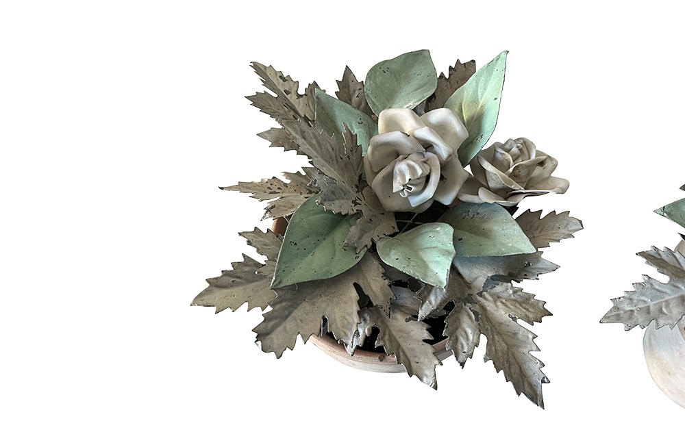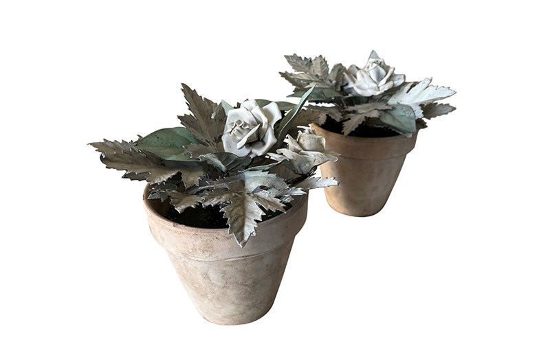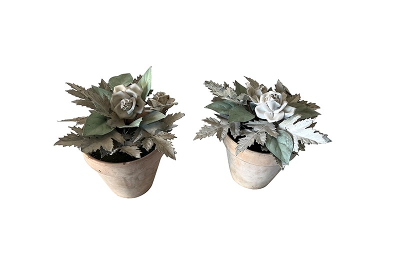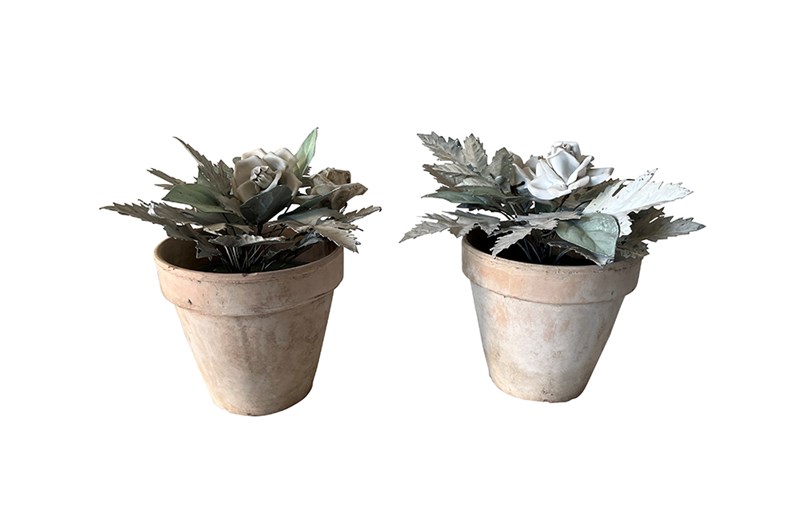 Pretty pair of terracotta pots planted with antique French tole foliage and porcelain flowers.