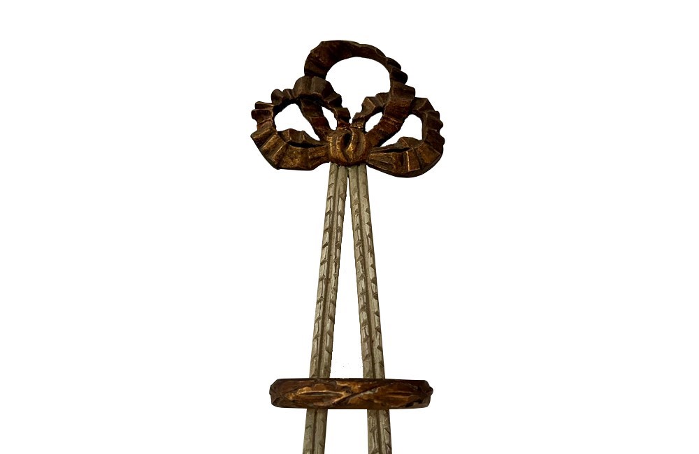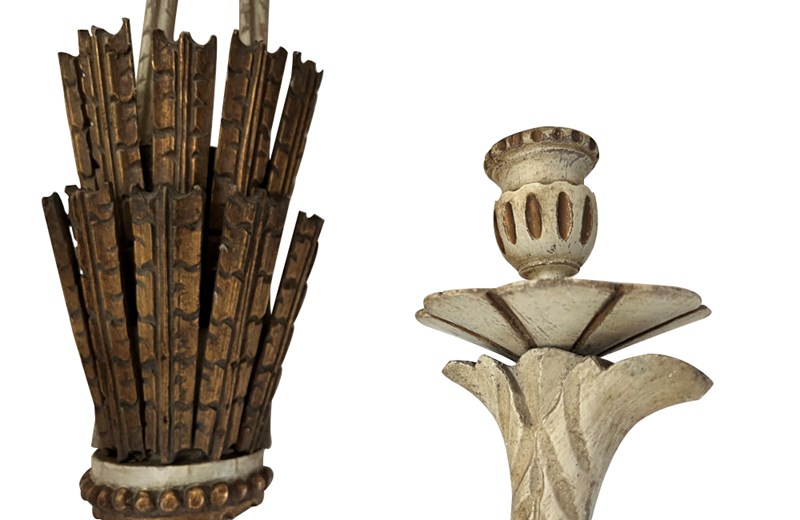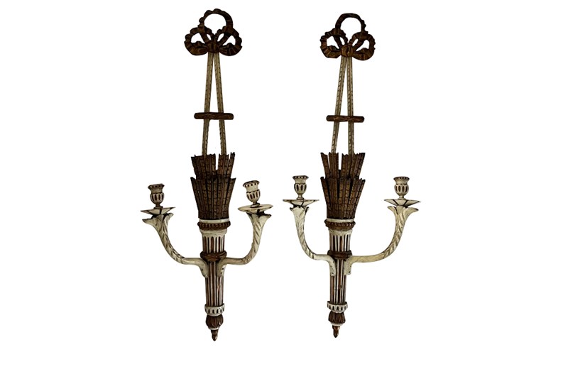 In the form of torcheres suspended from carved ribbons. Two curved branch candle holders. At some stage in the twentieth century, they were wired for electricity, which has now been removed.