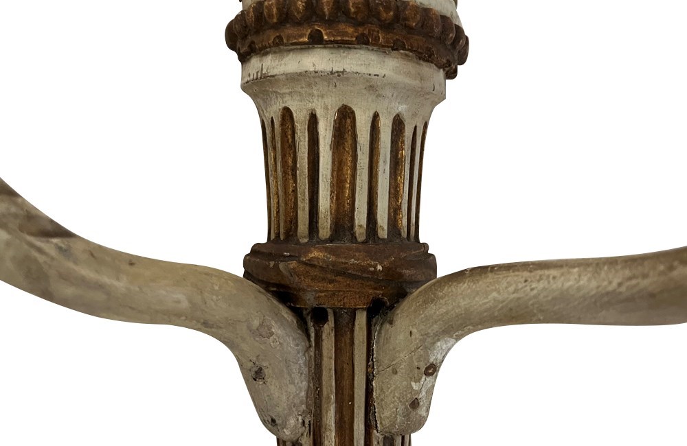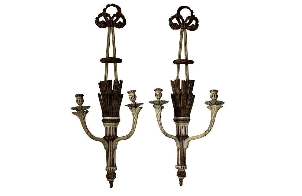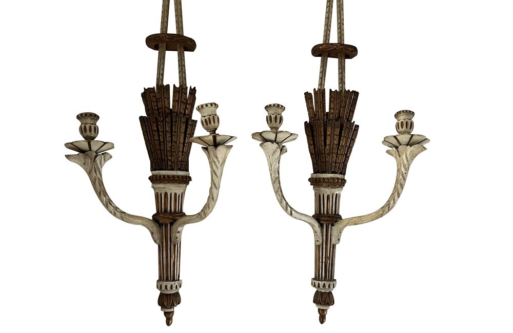 Beautiful pair of large late 19th Century Italian carved wooden wall lights in the Neo-Classical style.